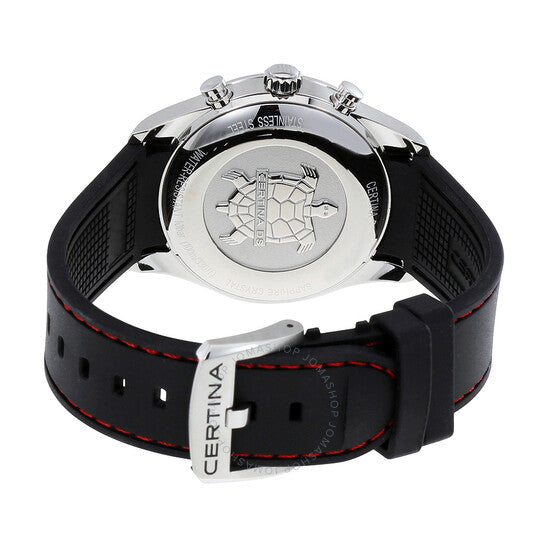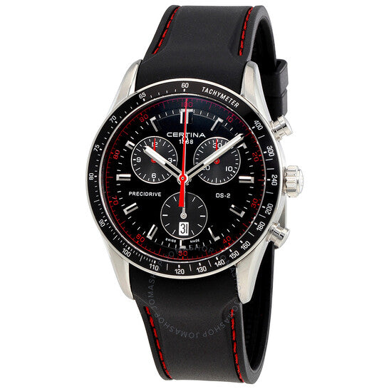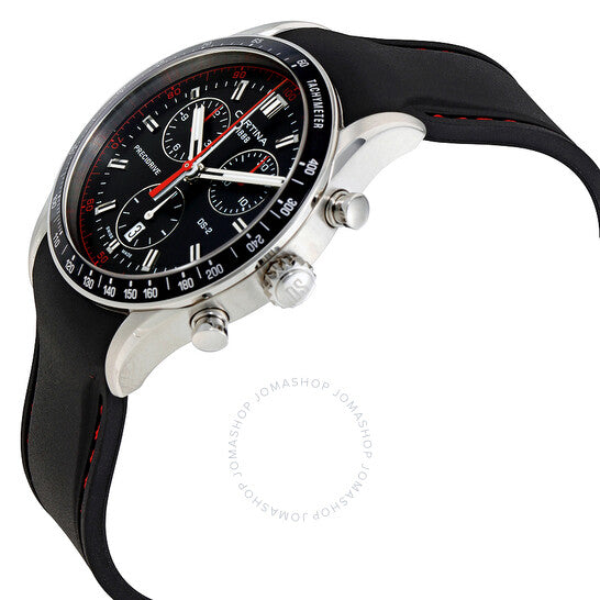 علبة من الفولاذ المقاوم للصدأ مع سوار مطاطي أسود. إطار ثابت من الفولاذ المقاوم للصدأ بحلقة علوية سوداء تُظهر علامات التاكيميتر. ميناء أسود بعقارب فضية مضيئة وعلامات ساعات مؤشرة. علامات دقائق. علامات 1/100 ثانية حول الحافة الخارجية. نوع الميناء: تناظري. عقارب مضيئة. عرض التاريخ عند موضع الساعة السادسة. كرونوغراف - ثلاثة أقراص فرعية تعرض: 30 دقيقة، 60 ثانية، و12 ساعة. آلية حركة كوارتز. زجاج ياقوت مقاوم للخدش. تاج لولبي. غطاء خلفي صلب. حجم العلبة: 40 مم. سُمكها: 13 مم. شكلها دائري. عرض السوار: 20 مم. مشبك تانغ. مقاومة للماء حتى عمق 100 متر / 330 قدمًا. الوظائف: كرونوغراف، تاكيميتر، تاريخ، ساعة، دقيقة، ثانية. طراز ساعة رياضية. ملصق الساعة: صناعة سويسرية. ساعة سيرتينا DS-2 كرونو مينا سوداء للرجال كوارتز C024.447.17.051.03.
