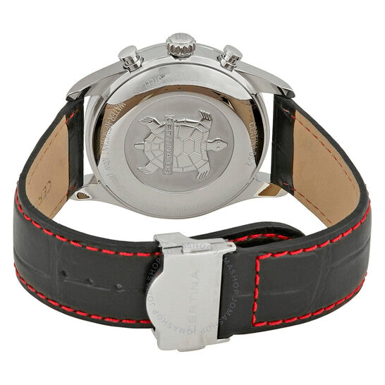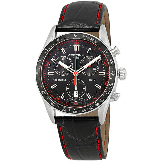 علبة من الفولاذ المقاوم للصدأ فضية اللون مع حزام أسود من جلد العجل. فولاذ مقاوم للصدأ فضي اللون ثابت مع حلقة علوية سوداء تُظهر علامات مقياس سرعة الدوران. مينا أسود بعقارب فضية اللون مضيئة وعلامات ساعات مؤشرة. علامات دقائق. مقياس 1/100 ثانية حول الحافة الخارجية. نوع المينا: تناظري. عقارب مضيئة. عرض التاريخ عند موضع الساعة السادسة. كرونوغراف - ثلاثة أقراص فرعية تعرض: 60 ثانية، 30 دقيقة، و12 ساعة. حركة كوارتز ETA Caliber 251.264. زجاج ياقوت مقاوم للخدش. تاج لولبي. غطاء خلفي صلب. شكل العلبة دائري، مقاس العلبة: 41 مم، سمكها: 14 مم. عرض السوار: 20 مم. مشبك قابل للطي. مقاومة للماء حتى عمق 100 متر / 330 قدمًا. الوظائف: كرونوغراف، راترابانت، تاريخ، ساعات، دقائق، ثوانٍ صغيرة، مقياس سرعة الدوران. سلسلة Ds-2. ساعة رياضية. صناعة سويسرية. ساعة سيرتينا DS-2 كرونوغراف للرجال، مينا سوداء، رقم الموديل C024.447.16.051.03.