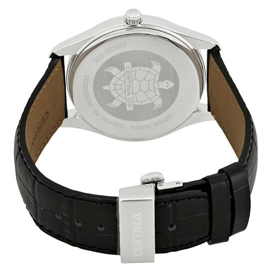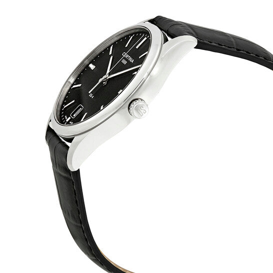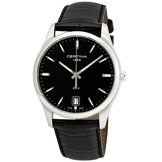 علبة من الفولاذ المقاوم للصدأ مع سوار جلدي أسود. إطار ثابت من الفولاذ المقاوم للصدأ. ميناء أسود بعقارب ومؤشرات ساعات فضية مضيئة. مؤشرات دقائق حول الحافة الخارجية. نوع الميناء: تناظري. عقارب ومؤشرات مضيئة. عرض التاريخ عند موضع الساعة السادسة. حركة كوارتز ETA عيار F07.111. زجاج ياقوتي مقاوم للخدش. تاج قابل للسحب/الدفع. غطاء خلفي صلب. شكل دائري. حجم العلبة: 40 مم. سمكها: 8 مم. عرض السوار: 21 مم. مشبك تانغ. مقاومة للماء حتى عمق 100 متر / 330 قدمًا. الوظائف: التاريخ، الساعة، الدقائق، الثواني. طراز ساعة رسمية. علامة الساعة: صناعة سويسرية. ساعة سيرتينا DS-4 للرجال بمينا أسود C022.610.16.051.00.