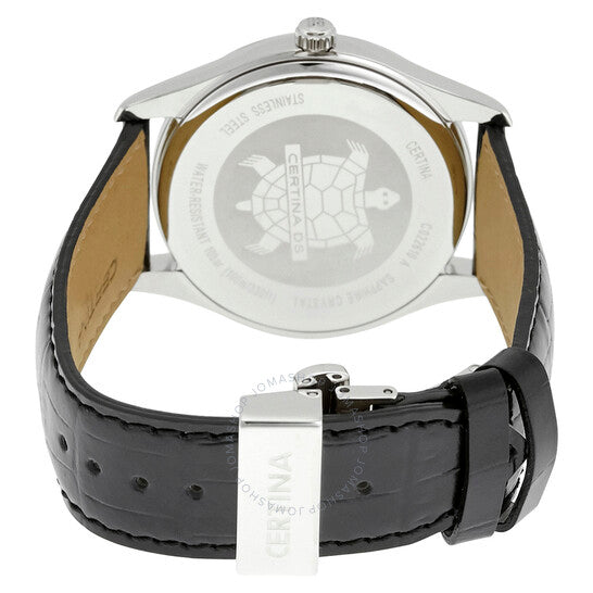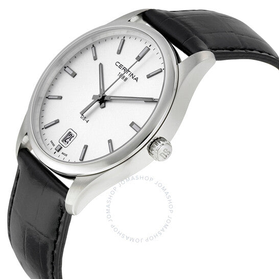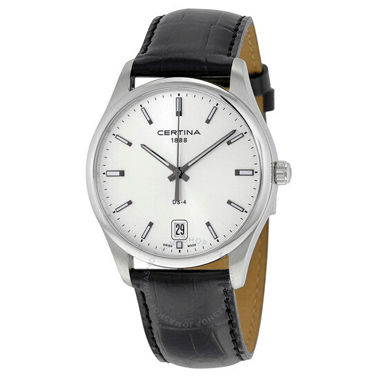 علبة من الفولاذ المقاوم للصدأ مع سوار جلدي أسود. إطار ثابت من الفولاذ المقاوم للصدأ. ميناء فضي مع عقارب ومؤشرات ساعات فضية مضيئة. مؤشرات دقائق حول الحافة الخارجية. نوع الميناء: تناظري. عقارب ومؤشرات مضيئة. عرض التاريخ عند موضع الساعة السادسة. حركة كوارتز ETA عيار F07.111. زجاج ياقوتي مقاوم للخدش. تاج قابل للسحب/الدفع. غطاء خلفي صلب. شكل دائري. حجم العلبة: 40 مم. سمكها: 12.45 مم. عرض السوار: 20 مم. مشبك فراشة. مقاومة للماء حتى عمق 100 متر / 330 قدمًا. الوظائف: التاريخ، الساعة، الدقائق، الثواني. تصميم كاجوال. علامة الساعة: صناعة سويسرية. ساعة سيرتينا DS-4 كوارتز للرجال بمينا فضي، C022.610.16.031.00.