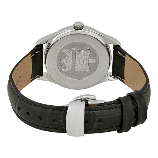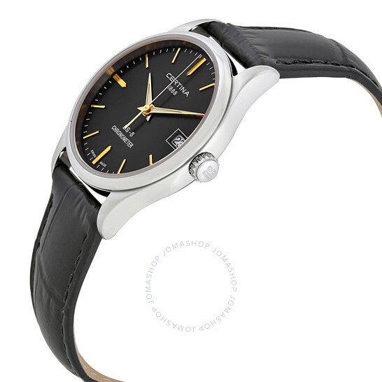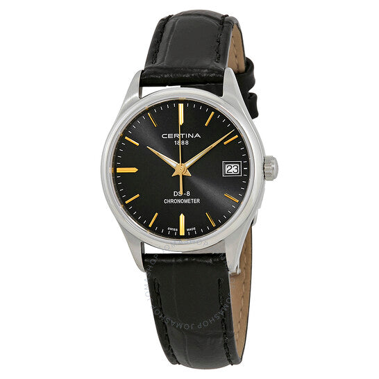 علبة من الفولاذ المقاوم للصدأ فضية اللون مع سوار جلدي أسود. إطار ثابت من الفولاذ المقاوم للصدأ فضي اللون. ميناء أنثراسيت بعقارب ذهبية اللون وعلامات ساعات. نوع الميناء: تناظري. عرض التاريخ عند موضع الساعة 3. حركة كوارتز F05.411. زجاج ياقوتي مقاوم للخدش. حجم العلبة: 30 مم. سُمكها: 6.9 مم. شكلها دائري. مقاومة للماء حتى عمق 100 متر / 330 قدمًا. الوظائف: التاريخ، الساعة، الدقائق، الثانية. علامة الساعة: صناعة سويسرية. ساعة سيرتينا DS-8 نسائية جلدية بمينا أنثراسيت، رقم الموديل: C033.251.16.351.01.