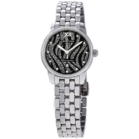 علبة من الفولاذ المقاوم للصدأ مع سوار من الفولاذ المقاوم للصدأ. إطار ثابت من الفولاذ المقاوم للصدأ. ميناء أسود (مرصع بأحجار الراين) بعقارب فضية اللون وعلامات ساعات منقطة. يظهر رقم روماني عند موضع الساعة ١٢. نوع الميناء: تناظري. عرض التاريخ أعلى موضع الساعة ٦. حركة كوارتز بريسيدرايف. زجاج ياقوت مقاوم للخدش. تاج قابل للسحب/الدفع. غطاء خلفي صلب. شكل دائري. حجم العلبة: ٢٧.٥٠ مم. سُمكها: ٧.٤ مم. مشبك فراشة بزر ضغط. مقاومة للماء حتى عمق ١٠٠ متر / ٣٣٠ قدمًا. الوظائف: التاريخ، الساعة، الدقيقة، الثانية. تصميم كاجوال. علامة الساعة: صناعة سويسرية. ساعة سيرتينا DS-8 النسائية كوارتز بمينا سوداء، C033.051.11.058.00.