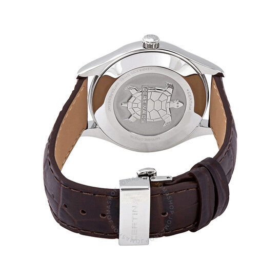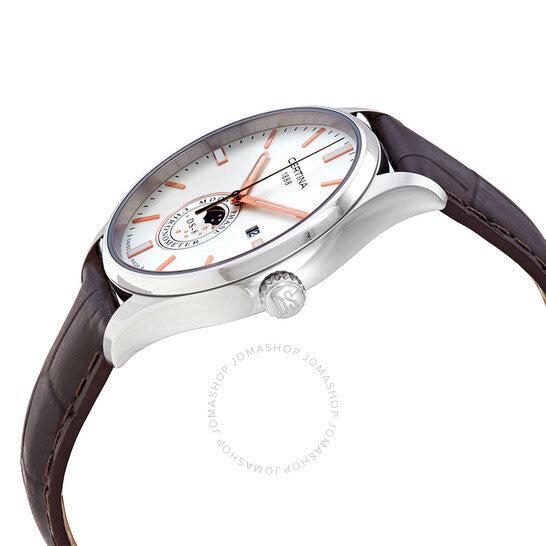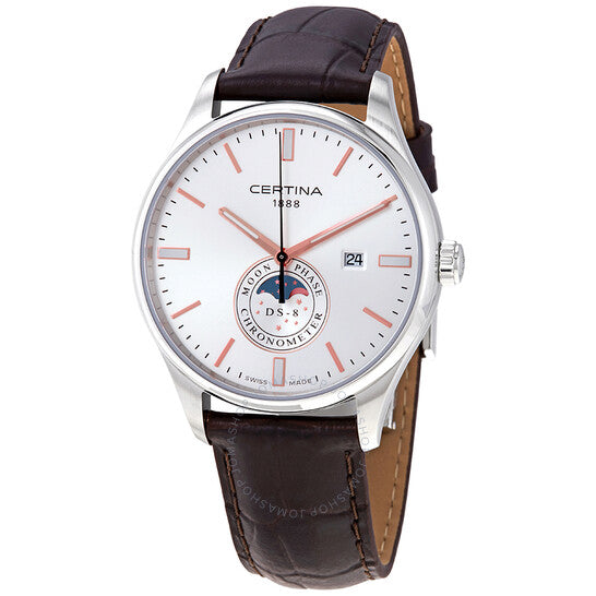 علبة من الفولاذ المقاوم للصدأ عيار 316L مع سوار جلدي بني. إطار ثابت من الفولاذ المقاوم للصدأ. ميناء فضي مع عقارب مضيئة بلون الذهب الوردي وعلامات ساعات. علامات دقائق حول الحافة الخارجية. نوع الميناء: تناظري. عقارب وعلامات مضيئة. عرض التاريخ عند موضع الساعة 3. ميناء فرعي لعرض أطوار القمر. حركة كوارتز معتمدة من Precidrive™ COSC كرونومتر. زجاج من الياقوت المقاوم للخدش. تاج قابل للسحب/الدفع. غطاء خلفي صلب. شكل دائري. حجم العلبة: 41 مم. سمكها: 10 مم. عرض السوار: 20 مم. مشبك قابل للطي. مقاومة للماء حتى عمق 100 متر / 330 قدم. الوظائف: التاريخ، الساعة، الدقيقة، الثانية، أطوار القمر، الكرونومتر. طراز ساعة رسمية. علامة الساعة: صناعة سويسرية. ساعة سيرتينا DS-8 كوارتز كرونومتر للرجال بمينا فضي، رقم الموديل: C033.457.16.031.00.
