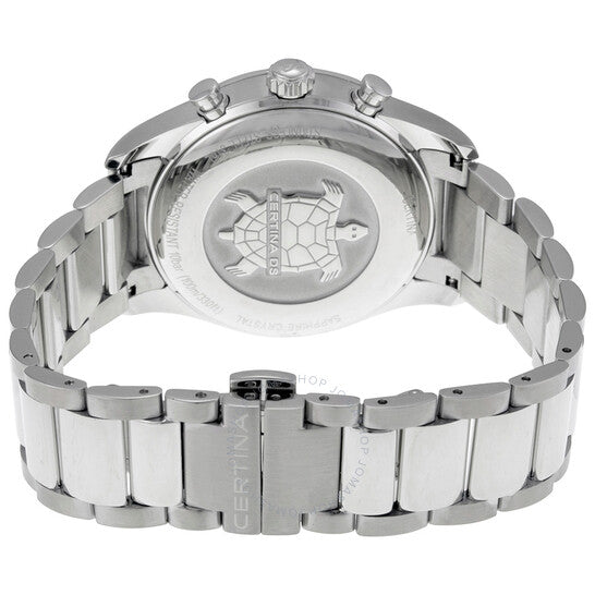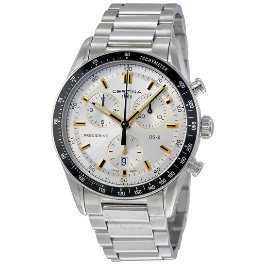 علبة من الفولاذ المقاوم للصدأ مع سوار من الفولاذ المقاوم للصدأ. إطار ثابت من الفولاذ المقاوم للصدأ مع حلقة علوية سوداء تُظهر علامات التاكيميتر. ميناء فضي بعقارب سوداء مضيئة وعلامات ساعات مؤشرة. علامات دقائق حول الحافة الخارجية. نوع الميناء: تناظري. عقارب وعلامات مضيئة. عرض التاريخ عند موضع الساعة السادسة. كرونوغراف - ثلاثة أقراص فرعية تعرض: ٦٠ ثانية، ٣٠ دقيقة، و١٢ ساعة. حركة كوارتز. زجاج ياقوت مقاوم للخدش. تاج قابل للدفع والسحب. غطاء خلفي صلب. حجم العلبة: ٤١ مم. سُمكها: ١٢.٩٥ مم. شكلها دائري. مشبك قابل للطي. مقاومة للماء حتى عمق ١٠٠ متر / ٣٣٠ قدمًا. الوظائف: كرونوغراف، تاكيميتر، تاريخ، ساعة، دقيقة، ثانية. تصميم كاجوال. ساعة سيرتينا دي إس ٢ كرونوغراف للرجال بمينا فضية C024.447.11.031.01.