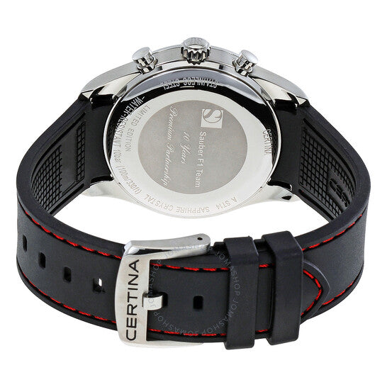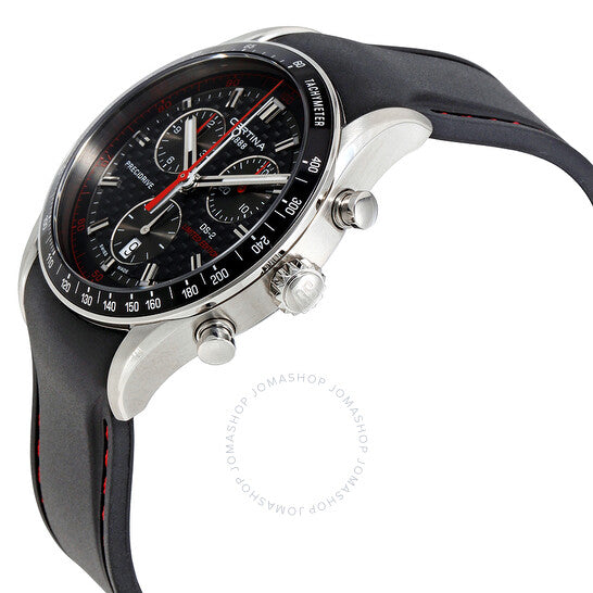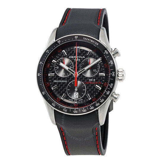 علبة من الفولاذ المقاوم للصدأ فضية اللون مع سوار مطاطي أسود. فولاذ مقاوم للصدأ فضي اللون ثابت مع إطار علوي أسود. مينا أسود بعقارب فضية اللون مضيئة وعلامات ساعات. علامات دقائق. علامات ١/١٠٠ حول الحافة الخارجية. نوع المينا: تناظري. عقارب مضيئة. عرض التاريخ عند موضع الساعة السادسة. كرونوغراف - ثلاثة أقراص فرعية تعرض: ٦٠ ثانية، ٣٠ دقيقة، و١٢ ساعة. حركة كوارتز ETA Caliber ٢٥١.٢٦٤. كريستال ياقوت مقاوم للخدش. تاج قابل للسحب/الدفع. غطاء خلفي صلب. شكل العلبة دائري، مقاسها: ٤١ مم، سمكها: ١٣ مم. عرض السوار: ٢٠ مم. مشبك تانغ. مقاومة للماء حتى عمق ١٠٠ متر / ٣٣٠ قدمًا. الوظائف: كرونوغراف، راترابانت، تاريخ، ساعات، دقائق، ثوانٍ صغيرة، تاكيمتر. معلومات إضافية: إصدار محدود ٢٠١٤ قطعة. سلسلة كرونوغراف DS-2 بريسيدرايف. ساعة كاجوال. علامة الساعة: صناعة سويسرية. ساعة سيرتينا DS 2 بريسيدرايف كرونوغراف بمينا سوداء، رقم الموديل C024.447.17.051.10.
