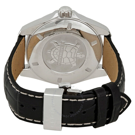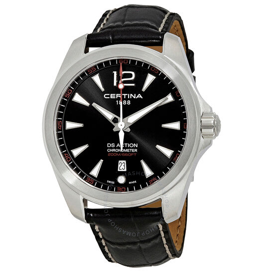 علبة من الفولاذ المقاوم للصدأ مع سوار جلدي أسود. إطار ثابت من الفولاذ المقاوم للصدأ. ميناء أسود بعقارب ومؤشرات ساعات فضية مضيئة. يظهر رقم عربي عند موضع الساعة ١٢. علامات دقائق حول الحافة الخارجية. نوع الميناء: تناظري. عقارب ومؤشرات مضيئة. عرض التاريخ عند موضع الساعة ٦. حركة كوارتز ETA عيار F06.411. زجاج ياقوتي مقاوم للخدش. تاج محمي. غطاء خلفي صلب. شكل دائري. حجم العلبة: ٤١ مم. سمكها: ١٠.٩ مم. عرض السوار: ٢٠ مم. مشبك فراشة. مقاومة للماء حتى عمق ٢٠٠ متر / ٦٦٠ قدمًا. الوظائف: التاريخ، الساعة، الدقيقة، الثانية، مؤشر عمر البطارية، الكرونومتر. تصميم ساعة كاجوال. علامة الساعة: صناعة سويسرية. ساعة سيرتينا دي إس أكشن للرجال بمينا سوداء، رقمها C032.851.16.057.01.