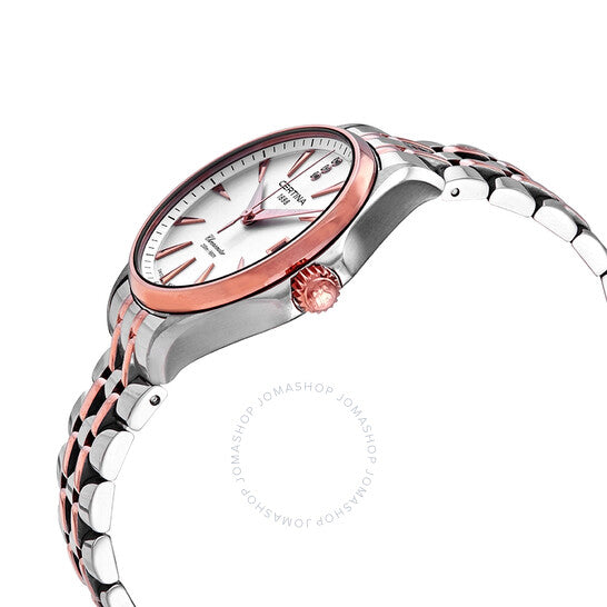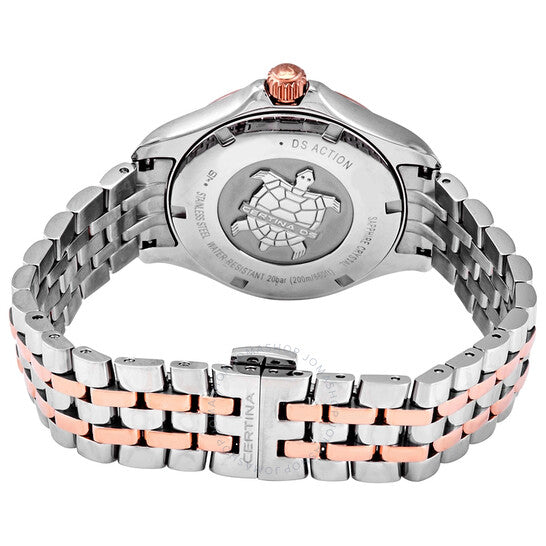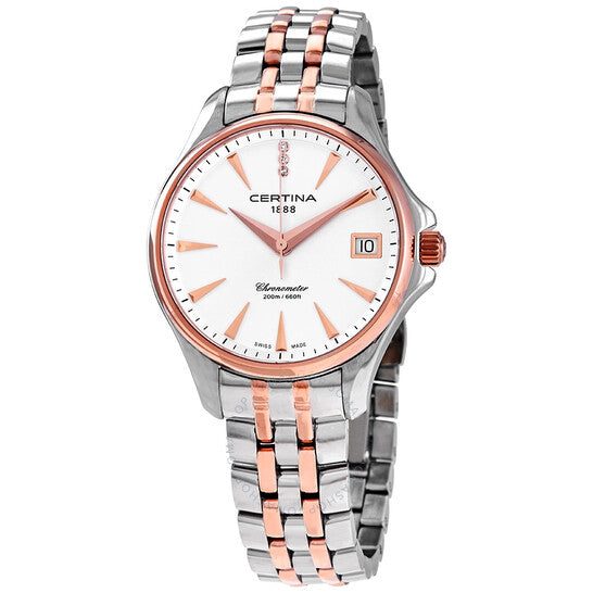 علبة من الفولاذ المقاوم للصدأ مع سوار من الفولاذ المقاوم للصدأ ثنائي اللون (فضي وذهبي وردي مطلي بتقنية PVD). إطار ثابت من الفولاذ المقاوم للصدأ مطلي بتقنية PVD باللون الذهبي الوردي. ميناء فضي مع عقارب وعلامات ساعات ذهبية وردية. مؤشر مرصع بالألماس عند موضع الساعة ١٢. علامات دقائق حول الحافة الخارجية. نوع الميناء: تناظري. عرض التاريخ عند موضع الساعة ٣. حركة كوارتز ETA F06.411 Precidrive. زجاج ياقوت مقاوم للخدش. تاج لولبي. غطاء خلفي صلب. شكل دائري. حجم العلبة: ٣٣.٨ مم. سمك العلبة: ٩.١٣ مم. عرض السوار: ١٦ مم. مشبك فراشة بزر ضغط. مقاومة للماء حتى عمق ٢٠٠ متر / ٦٦٠ قدمًا. الوظائف: التاريخ، الساعة، الدقيقة، الثانية. تصميم ساعة كاجوال. علامة الساعة: صناعة سويسرية. ساعة Certina DS Action Chronometer Diamonds نسائية ثنائية اللون C032.051.22.036.00.