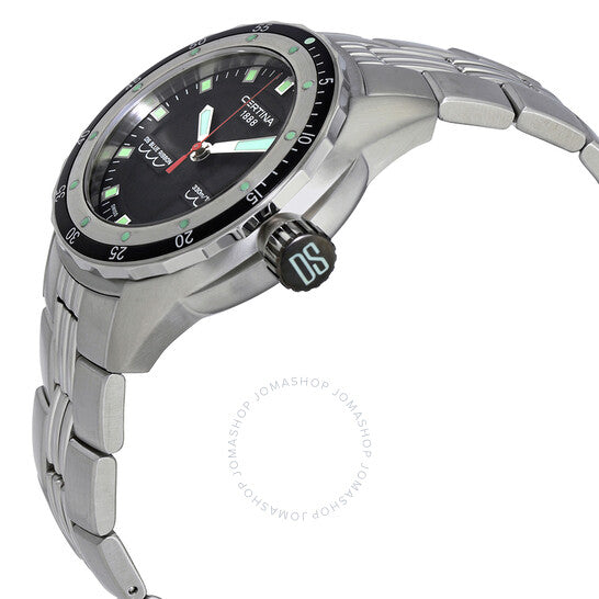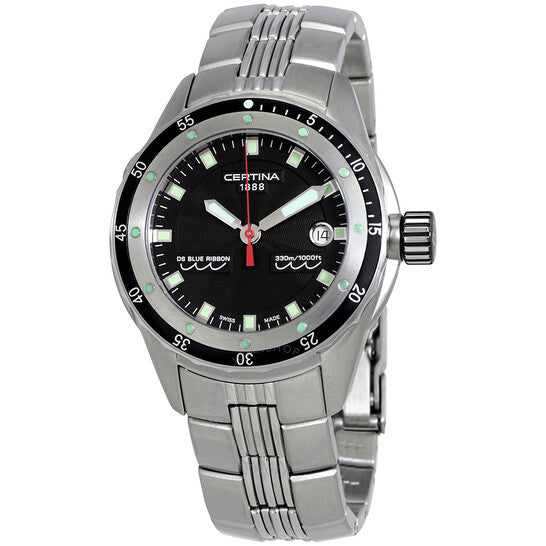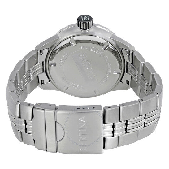 علبة من الفولاذ المقاوم للصدأ مع سوار من الفولاذ المقاوم للصدأ. إطار من الفولاذ المقاوم للصدأ بحلقة علوية سوداء. ميناء أسود بعقارب ومؤشرات ساعات فضية مضيئة. مؤشرات دقائق حول الحافة الخارجية. نوع الميناء: تناظري. عقارب ومؤشرات مضيئة. عرض التاريخ عند موضع الساعة 3. آلية حركة كوارتز. زجاج ياقوت مقاوم للخدش. تاج لولبي. غطاء خلفي صلب. حجم العلبة: 43 مم. سمكها: 14 مم. شكلها دائري. عرض السوار: 20 مم. طول السوار: 8 بوصات. مشبك قابل للطي مع مفتاح أمان. مقاومة للماء حتى عمق 330 مترًا / 1000 قدم. الوظائف: التاريخ، الساعة، الدقائق، الثواني. طراز ساعة الغوص. علامة الساعة: صناعة سويسرية. ساعة سيرتينا دي إس بلو ريبون للرجال، مينا سوداء، C007.410.11.051.00.