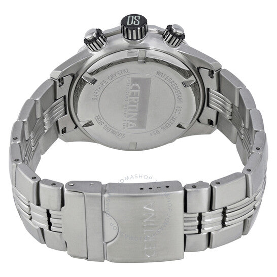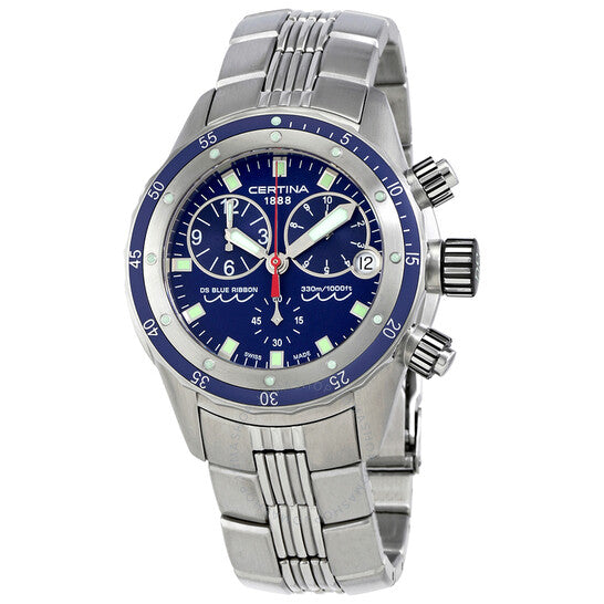 علبة من الفولاذ المقاوم للصدأ مع سوار من الفولاذ المقاوم للصدأ. إطار ثابت مطلي باللون الأزرق وفضي اللون. ميناء أزرق مع عقارب ومؤشرات ساعات فضية مضيئة. مؤشرات دقائق حول الحافة الخارجية. نوع الميناء: تناظري. عقارب ومؤشرات مضيئة. عرض التاريخ عند موضع الساعة 3. كرونوغراف - ثلاثة موانئ فرعية تعرض: 60 ثانية، 1/10 من الثانية، و12 ساعة. حركة كوارتز عيار ETA 251.262. كريستال ياقوت مقاوم للخدش. تاج لولبي. غطاء خلفي صلب. شكل دائري. حجم الهيكل: 43 مم. سمك الهيكل: 14 مم. عرض السوار: 20 مم. مشبك قابل للطي مع مفتاح أمان. مقاومة للماء حتى عمق 300 متر / 1000 قدم. الوظائف: كرونوغراف، تاريخ، ساعة، دقيقة، ثانية. سلسلة Ds Blue Ribbon. طراز ساعة الغوص. ملصق الساعة: صناعة سويسرية. ساعة سيرتينا دي إس بلو ريبون كرونوغراف للرجال C007.417.11.041.00.