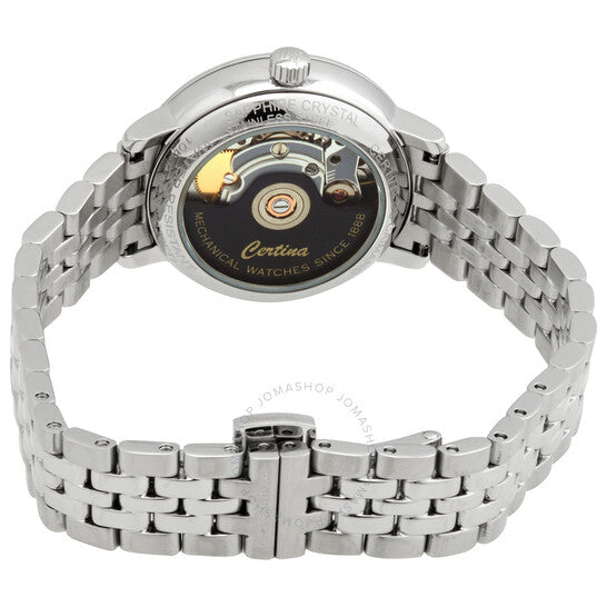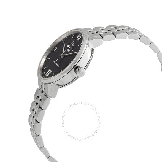 علبة من الفولاذ المقاوم للصدأ مع سوار من الفولاذ المقاوم للصدأ. إطار ثابت من الفولاذ المقاوم للصدأ. ميناء أسود بعقارب فضية اللون وعلامات ساعات. أرقام عربية تُشير إلى الساعات 3 و9 و12. علامات دقائق حول الحافة الخارجية. نوع الميناء: تناظري. عرض التاريخ عند الساعة 6. حركة أوتوماتيكية Powermatic 80 مع احتياطي طاقة يصل إلى 80 ساعة. زجاج من الياقوت المقاوم للخدش. تاج قابل للسحب/الدفع. غطاء خلفي شفاف. شكل دائري. حجم العلبة: 31 مم. سمكها: 8.9 مم. عرض السوار: 14 مم. مشبك قابل للطي مع مفتاح أمان. مقاومة للماء حتى عمق 100 متر / 330 قدمًا. الوظائف: التاريخ، الساعة، الدقيقة، الثانية. سلسلة Ds Caimano. تصميم ساعة كاجوال. علامة الساعة: صناعة سويسرية. ساعة Certina DS Caimano أوتوماتيكية نسائية بمينا أسود C035.207.11.057.00.