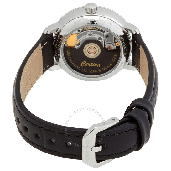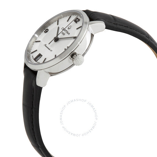 علبة من الفولاذ المقاوم للصدأ مع سوار جلدي أسود. إطار ثابت من الفولاذ المقاوم للصدأ. ميناء فضي بعقارب سوداء وعلامات ساعات. أرقام عربية تُشير إلى الساعات 3 و9 و12. علامات دقائق حول الحافة الخارجية. نوع الميناء: تناظري. نافذة عرض التاريخ عند الساعة 6. حركة أوتوماتيكية Powermatic 80 مع احتياطي طاقة يصل إلى 80 ساعة. زجاج ياقوت مقاوم للخدش. تاج قابل للسحب/الدفع. غطاء خلفي شفاف. شكل دائري. حجم العلبة: 31 مم. سمكها: 8.9 مم. عرض السوار: 14 مم. مشبك قابل للطي. مقاومة للماء حتى عمق 100 متر / 330 قدمًا. الوظائف: التاريخ، الساعة، الدقيقة، الثانية. سلسلة Ds Caimano. تصميم ساعة كاجوال. علامة الساعة: صناعة سويسرية. ساعة Certina DS Caimano أوتوماتيكية نسائية بمينا فضي C035.207.16.037.00.