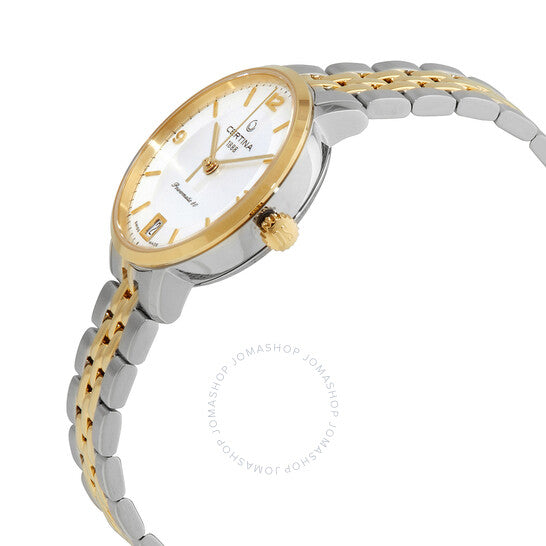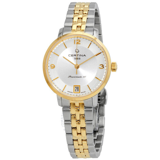 علبة من الفولاذ المقاوم للصدأ مع سوار من الفولاذ المقاوم للصدأ ثنائي اللون (فضي وذهبي أصفر مطلي بتقنية PVD). إطار ثابت من الذهب الأصفر مطلي بتقنية PVD. ميناء فضي مع عقارب وعلامات ساعات ذهبية صفراء. أرقام عربية تشير إلى مواضع الساعة 3 و9 و12. علامات الدقائق حول الحافة الخارجية. نوع الميناء: تناظري. عرض التاريخ عند موضع الساعة 6. حركة أوتوماتيكية Powermatic 80 مع احتياطي طاقة لمدة 80 ساعة. زجاج من الياقوت المقاوم للخدش. تاج قابل للسحب/الدفع. غطاء خلفي شفاف. شكل دائري. حجم العلبة: 31 مم. سمك العلبة: 8.9 مم. عرض السوار: 14 مم. مشبك فراشة. مقاومة للماء حتى عمق 100 متر / 330 قدمًا. الوظائف: التاريخ والساعة والدقيقة والثانية. سلسلة Ds Caimano. تصميم ساعة كاجوال. ملصق الساعة: صنع سويسري. ساعة Certina DS Caimano أوتوماتيكية للسيدات بمينا فضي C035.207.22.037.02.
