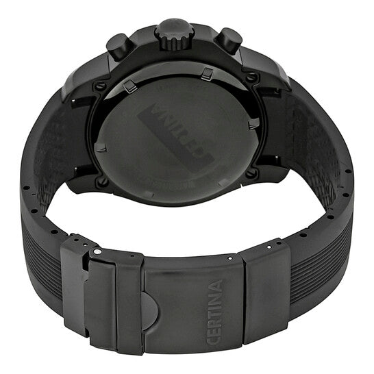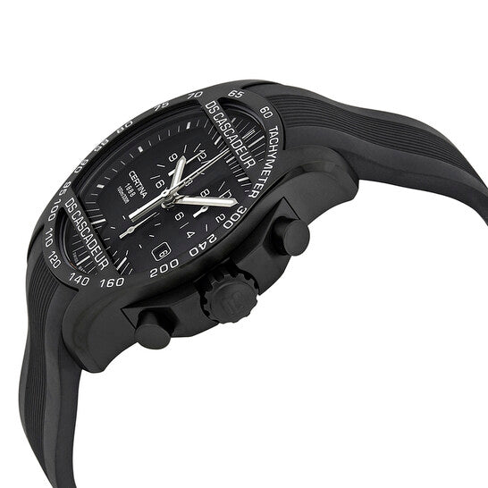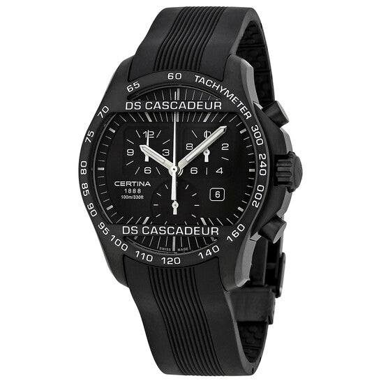 علبة من الفولاذ المقاوم للصدأ مطلية باللون الأسود بتقنية PVD مع سوار مطاطي أسود. إطار ثابت مطلي باللون الأسود بتقنية PVD يعرض علامات التاكيميتر. ميناء أسود بعقارب فضية مضيئة وعلامات ساعات. علامات دقائق حول الحافة الخارجية. نوع الميناء: تناظري. عقارب وعلامات مضيئة. عرض التاريخ عند موضع الساعة الرابعة. كرونوغراف - ثلاثة أقراص فرعية تعرض: ٦٠ ثانية، ١٢ ساعة، و١/١٠ من الثانية. حركة كوارتز. زجاج ياقوت مقاوم للخدش. تاج لولبي. غطاء خلفي صلب. حجم العلبة: ٤٢ مم. سمكها: ١٣ مم. شكلها دائري. عرض السوار: ٢١ مم. طول السوار: ٨ بوصات. مشبك قابل للطي. مقاومة للماء حتى عمق ١٠٠ متر / ٣٣٠ قدمًا. الوظائف: كرونوغراف، تاكيميتر، تاريخ، ساعة، دقيقة، ثانية. تصميم كاجوال. علامة الساعة: صناعة سويسرية. ساعة سيرتينا دي إس كاسكيدور كرونوغراف للرجال C003.617.17.050.00.