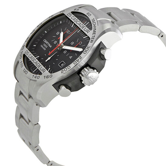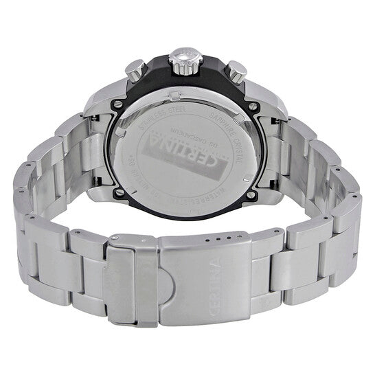 علبة من الفولاذ المقاوم للصدأ مع سوار من الفولاذ المقاوم للصدأ. إطار ثابت من الفولاذ المقاوم للصدأ. ميناء أسود بعقارب فضية مضيئة ومؤشرات ساعات. مؤشرات دقائق حول الحافة الخارجية. نوع الميناء: تناظري. عقارب ومؤشرات مضيئة. عرض التاريخ بين موضعي الساعة الرابعة والخامسة. كرونوغراف - ثلاثة موانئ فرعية تعرض: 60 ثانية، 12 ساعة، و1/10 من الثانية. حركة كوارتز عيار ETA 251.262. زجاج ياقوتي مقاوم للخدش. حجم العلبة: 42 مم. سُمكها: 13.8 مم. شكلها دائري. مقاومة للماء حتى عمق 100 متر / 330 قدم. الوظائف: كرونوغراف، تاريخ، ساعة، دقيقة، ثانية صغيرة. تصميم كاجوال. علامة الساعة: صناعة سويسرية. ساعة سيرتينا دي إس كاسكادور كرونوغراف للرجال C003.617.21.050.00.