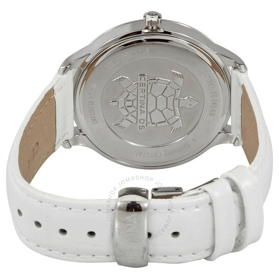 علبة من الفولاذ المقاوم للصدأ مع سوار جلدي أبيض. إطار ثابت من الفولاذ المقاوم للصدأ. ميناء فضي بعقارب مضيئة ومؤشرات ساعات. يظهر رقم عربي عند موضع الساعة ١٢. نوع الميناء: تناظري. عقارب مضيئة. عرض التاريخ عند موضع الساعة ٦. حركة كوارتز ETA عيار F07.411. زجاج ياقوت مقاوم للخدش. تاج قابل للسحب/الدفع. غطاء خلفي صلب. شكل دائري. حجم العلبة: ٣٨ مم. سمكها: ٧.٤٧ مم. عرض السوار: ١٨ مم. مشبك تانغ. مقاومة للماء حتى عمق ١٠٠ متر / ٣٣٠ قدمًا. الوظائف: التاريخ، الساعة، الدقيقة، الثانية. سلسلة Ds Dream Precidrive. تصميم كاجوال. علامة الساعة: صناعة سويسرية. ساعة Certina DS Dream Precidrive النسائية بمينا فضي C021.810.66.037.00.