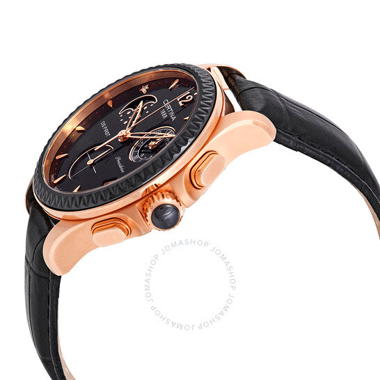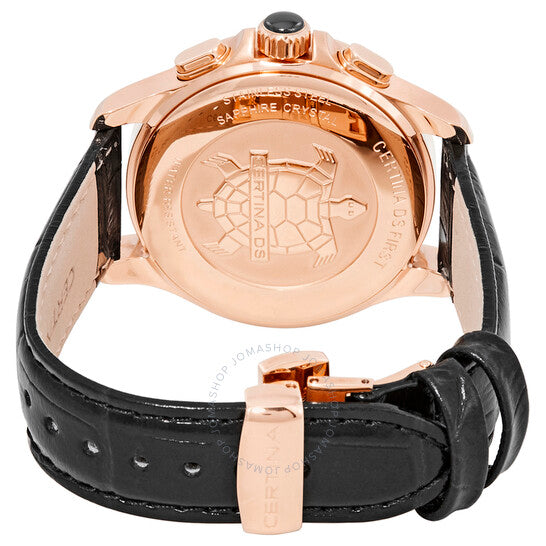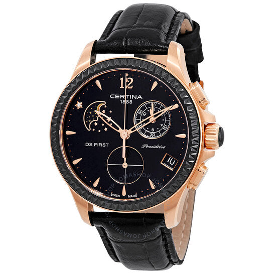 علبة من الفولاذ المقاوم للصدأ مطلية بالذهب الوردي بتقنية PVD مع سوار جلدي أسود. إطار من الذهب الوردي بتقنية PVD مع حلقة علوية من السيراميك الأسود. ميناء أسود بعقارب هيكلية بلون الذهب الوردي وعلامات ساعات مؤشرة. يظهر رقم عربي عند موضع الساعة ١٢. علامات دقائق حول الحافة الخارجية. نوع الميناء: تناظري. عرض التاريخ عند موضع الساعة ٤. كرونوغراف - ثلاثة أقراص فرعية تعرض: ٦٠ ثانية، ٦٠ دقيقة / ١٢ ساعة مزدوجة، وأطوار القمر. حركة كوارتز G10.962 BH. كريستال ياقوتي مقاوم للخدش. غطاء خلفي صلب. شكل دائري. حجم العلبة: ٣٨ مم. سمكها: ١٢.٥ مم. مشبك قابل للطي. مقاومة للماء حتى عمق ١٠٠ متر / ٣٣٠ قدمًا. الوظائف: التاريخ، الساعة، الدقائق، الثواني، أطوار القمر. تصميم ساعة كاجوال. علامة الساعة: صناعة سويسرية. ساعة Certina DS First Lady ذات الميناء الأسود ومراحل القمر C030.250.36.056.00.