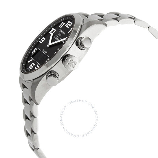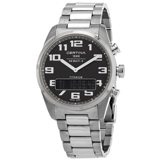 علبة وسوار من التيتانيوم الرمادي. إطار ثابت من التيتانيوم الرمادي. ميناء رقمي أسود مع عقارب فضية مضيئة وعلامات ساعات بأرقام عربية. علامات دقائق حول الحافة الخارجية. نوع الميناء: تناظري-رقمي. شاشة رقمية. حركة كوارتز. زجاج ياقوت مقاوم للخدش. غطاء خلفي صلب. شكل دائري. مقاس الهيكل: 42 مم. سمك الهيكل: 13 مم. عرض السوار: 22 مم. مشبك قابل للطي. مقاومة للماء حتى عمق 100 متر / 330 قدمًا. الوظائف: الساعات، الدقائق، المنبه، متعدد الموانئ، اليوم/التاريخ. سلسلة Ds Multi-8. طراز الساعة الرياضية. ساعة Certina DS Multi-8 Alarm كوارتز تناظرية-رقمية للرجال C0204194408201.