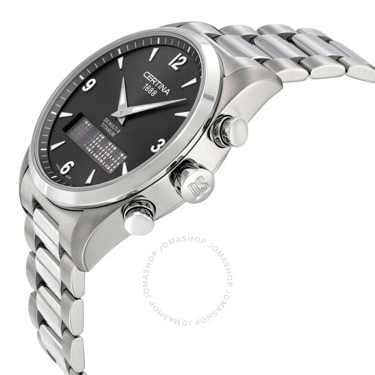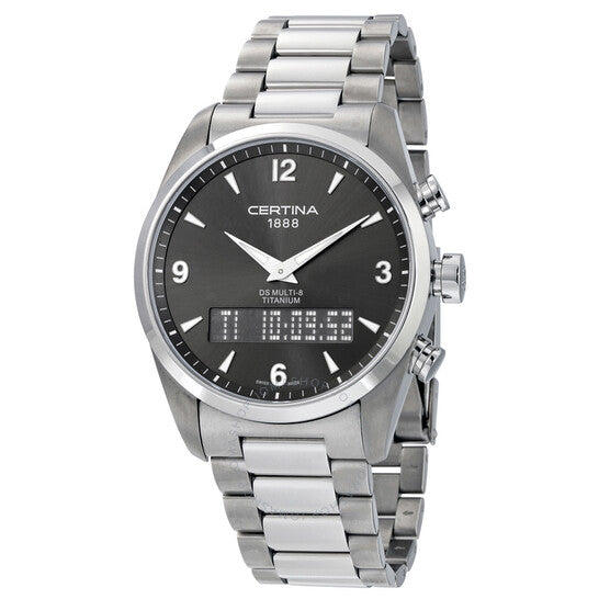 علبة من التيتانيوم مع سوار من التيتانيوم. إطار ثابت من التيتانيوم. ميناء رمادي اللون مع عقارب فضية مضيئة ومؤشرات ساعات. أرقام عربية تُشير إلى مواقع الساعات 3 و9 و12. مؤشرات دقائق حول الحافة الخارجية. نوع الميناء: تناظري-رقمي. عقارب مضيئة. ميناء فرعي رقمي. حركة كوارتز عيار ETA E49.351. زجاج ياقوت مقاوم للخدش. غطاء خلفي صلب. حجم العلبة: 42 مم. سُمكها: 13 مم. شكلها دائري. عرض السوار: 22 مم. مشبك قابل للطي بزر ضغط. مقاومة للماء حتى عمق 100 متر / 330 قدمًا. الوظائف: الساعات، الدقائق، الكرونوغراف، التاريخ، التقويم الدائم، منطقة زمنية بتوقيت غرينتش/ثانية، عرض السنة، منبه، عرض اليوم. طراز الساعة الرياضية. علامة الساعة: صناعة سويسرية. ساعة سيرتينا دي إس مولتي-8 كوارتز رجالية من التيتانيوم C020.419.44.087.00.