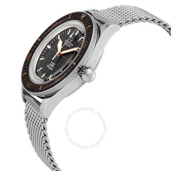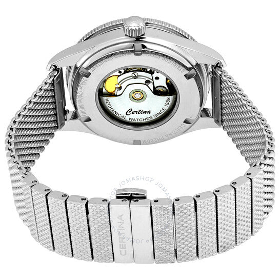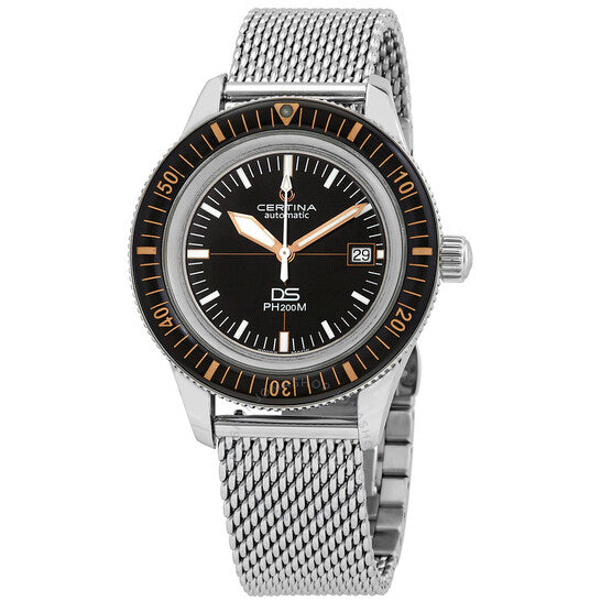 علبة من الفولاذ المقاوم للصدأ مع سوار شبكي من الفولاذ المقاوم للصدأ. إطار دوار أحادي الاتجاه من الفولاذ المقاوم للصدأ مع حلقة سيراميك سوداء مقببة. ميناء أسود بعقارب ومؤشرات ساعات مضيئة بلون الذهب الوردي. مؤشرات دقائق حول الحافة الخارجية. نوع الميناء: تناظري. عقارب ومؤشرات مضيئة. عرض التاريخ عند موضع الساعة 3. حركة أوتوماتيكية Powermatic 80.611 مع احتياطي طاقة يصل إلى 80 ساعة. زجاج من الياقوت المقاوم للخدش. غطاء خلفي شفاف. شكل دائري. حجم العلبة: 42.8 مم. سمكها: 11.9 مم. عرض السوار: 20 مم. مشبك قابل للطي. مقاومة للماء حتى عمق 200 متر / 660 قدم. الوظائف: التاريخ، الساعة، الدقائق، الثواني. سلسلة Ds Ph200m. تصميم ساعة كاجوال. علامة الساعة: صناعة سويسرية. ساعة Certina DS PH200M أوتوماتيكية بمينا أسود C036.407.11.050.01.