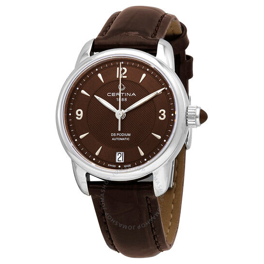 علبة من الفولاذ المقاوم للصدأ مع سوار جلدي بني. إطار ثابت من الفولاذ المقاوم للصدأ فضي اللون. ميناء بني مع عقارب مضيئة فضية اللون وعلامات ساعات. أرقام عربية تشير إلى مواقع الساعات 3 و9 و12. علامات دقائق حول الحافة الخارجية. نوع الميناء: تناظري. عقارب مضيئة. عرض التاريخ عند موضع الساعة 6. عيار ETA 2824-2، حركة أوتوماتيكية، مبنية على ETA 2824، تحتوي على 25 جوهرة، تنبض بمعدل 28800 ذبذبة في الساعة، ولديها احتياطي طاقة لمدة 38 ساعة تقريبًا. زجاج ياقوت مقاوم للخدش. تاج قابل للسحب/الدفع. غطاء خلفي شفاف. شكل دائري. حجم العلبة: 32.5 مم. سمك العلبة: 10 مم. مشبك تانغ. مقاومة للماء حتى عمق 100 متر / 330 قدمًا. الوظائف: التاريخ، الساعة، الدقيقة، الثانية. سلسلة Ds Podium. تصميم ساعة كاجوال. ملصق الساعة: صناعة سويسرية. ساعة سيرتينا دي إس بوديوم أوتوماتيكية بمينا بني للسيدات C025.207.16.297.00.