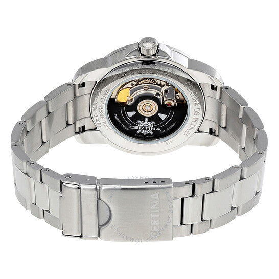 علبة من الفولاذ المقاوم للصدأ مع سوار من الفولاذ المقاوم للصدأ. إطار ثابت من الفولاذ المقاوم للصدأ. ميناء فضي مع عقارب مضيئة بلون فضي وعلامات ساعات. أرقام عربية تُشير إلى الساعات 3 و9 و12. علامات دقائق حول الحافة الخارجية. نوع الميناء: تناظري. عقارب مضيئة. عرض التاريخ عند الساعة 6. حركة سيرتينا كاليبر باورماتيك 80 (ETA C07.111) أوتوماتيكية، مبنية على ETA 2824-2، تحتوي على 23 جوهرة، تنبض بتردد 21600 ذبذبة في الساعة، ولديها احتياطي طاقة يدوم حوالي 80 ساعة. زجاج ياقوت مقاوم للخدش. غطاء خلفي شفاف. شكل دائري. حجم العلبة: 38 مم. سمك العلبة: 10.5 مم. عرض السوار: 19 مم. مشبك قابل للطي بزر ضغط. مقاومة للماء حتى عمق 100 متر / 330 قدمًا. الوظائف: التاريخ، الساعة، الدقائق، الثواني. سلسلة Ds Podium. ساعة رسمية. علامة الساعة: صناعة سويسرية. رقم المنتج: C0344071103700. ساعة Certina DS Podium أوتوماتيكية للرجال بمينا فضي، C034.407.11.037.00.