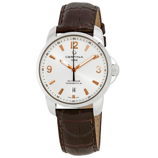 علبة من الفولاذ المقاوم للصدأ مع سوار جلدي بني. إطار ثابت من الفولاذ المقاوم للصدأ. ميناء فضي مع عقارب مضيئة بلون الذهب الوردي وعلامات ساعات. أرقام عربية تُشير إلى الساعات 3 و9 و12. علامات دقائق حول الحافة الخارجية. نوع الميناء: تناظري. عقارب مضيئة. نافذة عرض التاريخ عند الساعة 6. حركة سيرتينا كاليبر باورماتيك 80 (ETA C07.111) أوتوماتيكية، مبنية على ETA 2824-2، تحتوي على 23 جوهرة، تنبض بتردد 21600 ذبذبة في الساعة، ولديها احتياطي طاقة يدوم حوالي 80 ساعة. زجاج ياقوت مقاوم للخدش. تاج قابل للسحب/الدفع. غطاء خلفي شفاف. شكل دائري. حجم العلبة: 38 مم. سمك العلبة: 10.5 مم. عرض السوار: 19 مم. مشبك قابل للطي بزر ضغط. مقاومة للماء حتى عمق 100 متر / 330 قدمًا. الوظائف: التاريخ، الساعة، الدقائق، الثواني. سلسلة DS Podium. ساعة رسمية. علامة الساعة: صناعة سويسرية. ساعة Certina DS Podium أوتوماتيكية للرجال بمينا فضي C034.407.16.037.01.