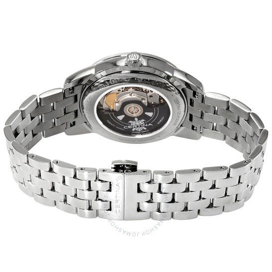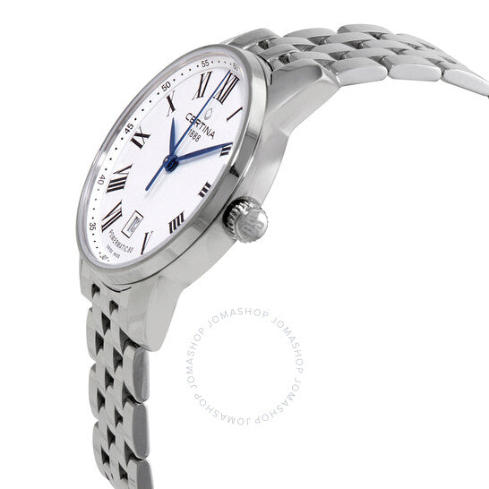 علبة وسوار من الفولاذ المقاوم للصدأ فضي اللون. إطار ثابت من الفولاذ المقاوم للصدأ فضي اللون. ميناء أبيض بعقارب زرقاء وعلامات ساعات رومانية. علامات دقائق عربية (بفاصل ٥ دقائق). علامات دقائق حول الحافة الخارجية. نوع الميناء: تناظري. عرض التاريخ أعلى موضع الساعة السادسة. حركة أوتوماتيكية ETA Caliber 2836-2، مبنية على ETA 2824-2، تحتوي على ٢٥ جوهرة، تنبض بتردد ٢٨٨٠٠ ذبذبة في الساعة، ولديها احتياطي طاقة لمدة ٤٠ ساعة تقريبًا. زجاج ياقوت مقاوم للخدش. تاج قابل للسحب/الدفع. غطاء خلفي شفاف. شكل العلبة دائري، مقاس العلبة: ٣٩ مم، سمكها: ٩.٨ مم. عرض السوار: ١٩ مم. مشبك قابل للطي بزر ضغط. مقاومة للماء حتى عمق ١٠٠ متر / ٣٣٠ قدمًا. الوظائف: التاريخ، الساعة، الدقيقة، الثانية. سلسلة Ds Podium. تصميم ساعة كاجوال. ملصق الساعة: صناعة سويسرية. ساعة سيرتينا دي إس بوديوم أوتوماتيكية للرجال بمينا أبيض C0348071101300.