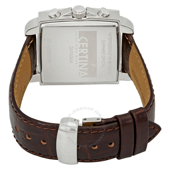علبة من الفولاذ المقاوم للصدأ مع سوار جلدي بني. إطار ثابت من الفولاذ المقاوم للصدأ. ميناء بني مع عقارب ومؤشرات ساعات فضية مضيئة. أرقام عربية تُشير إلى الساعات 3 و9 و12. علامات دقائق حول الحافة الخارجية. نوع الميناء: تناظري. عقارب ومؤشرات مضيئة. عرض التاريخ عند الساعة 4. كرونوغراف - ثلاثة أقراص فرعية تعرض: 60 ثانية، 30 دقيقة، و12 ساعة. آلية حركة كوارتز. زجاج ياقوت مقاوم للخدش. تاج قابل للسحب/الدفع. غطاء خلفي شفاف. شكل العلبة مربع. حجم العلبة: 32 مم. سمكها: 11 مم. عرض السوار: 19 مم. طول السوار: 7 بوصات. مشبك قابل للطي مرتين. مقاومة للماء حتى عمق 100 متر / 330 قدمًا. الوظائف: كرونوغراف، تاريخ، ساعة، دقيقة، ثانية. تصميم كاجوال. علامة الساعة: صناعة سويسرية. ساعة سيرتينا دي إس بوديوم كرونوغراف بمينا بني للسيدات C001.317.16.297.00.