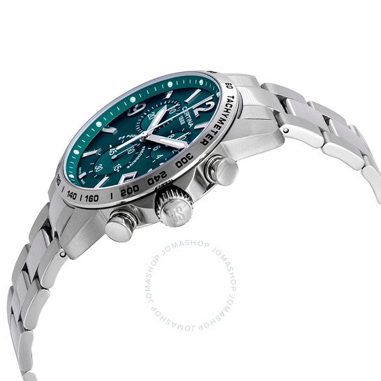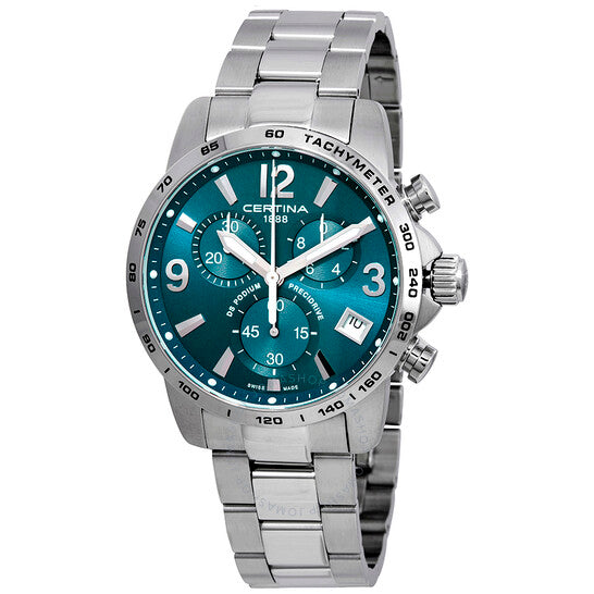 علبة من الفولاذ المقاوم للصدأ مع سوار من الفولاذ المقاوم للصدأ. إطار ثابت من الفولاذ المقاوم للصدأ يعرض علامات التاكيمتر. ميناء أخضر مع عقارب فضية مضيئة وعلامات ساعات. أرقام عربية تشير إلى مواقع الساعات 3 و9 و12. علامات دقائق حول الحافة الخارجية. نوع الميناء: تناظري. عقارب وعلامات مضيئة. عرض التاريخ عند موضع الساعة 4. كرونوغراف - ثلاثة أقراص فرعية تعرض: 60 ثانية، 30 دقيقة، و1/10 من الثانية. حركة كوارتز Precidrive™. كريستال ياقوت مقاوم للخدش. تاج لولبي. غطاء خلفي صلب. شكل دائري. حجم الهيكل: 41 مم. سمك الهيكل: 11.7 مم. عرض السوار: 20 مم. مشبك قابل للطي بزر ضغط. مقاومة للماء حتى عمق 100 متر / 330 قدمًا. الوظائف: كرونوغراف، تاكيمتر، تاريخ، ساعة، دقيقة، ثانية. سلسلة DS Podium. تصميم ساعة كاجوال. علامة الساعة: صناعة سويسرية. ساعة سيرتينا دي إس بوديوم كرونوغراف للرجال بمينا أخضر، رقمها C034.417.11.097.00.