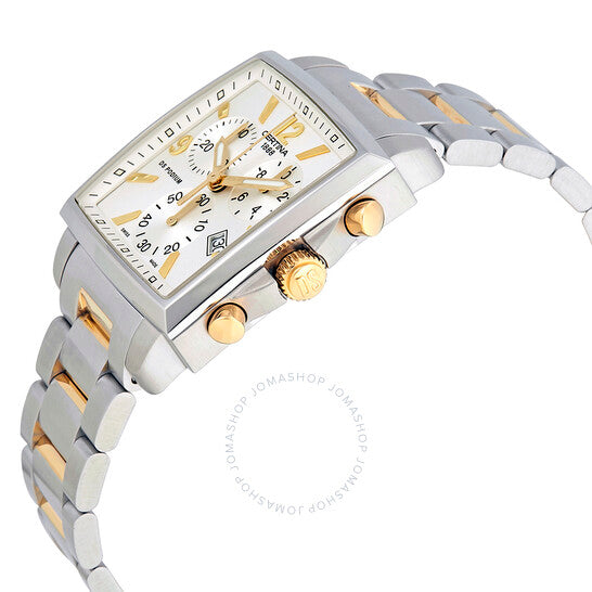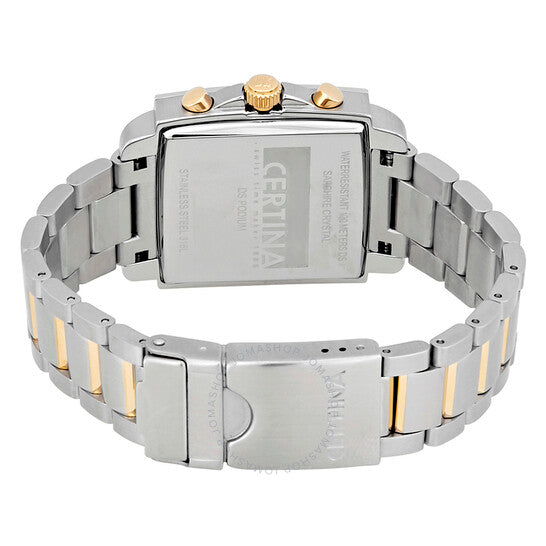 علبة من الفولاذ المقاوم للصدأ مع سوار من الفولاذ المقاوم للصدأ بلمسات من الذهب الأصفر. إطار ثابت من الفولاذ المقاوم للصدأ. ميناء فضي مع عقارب ذهبية مضيئة ومؤشرات ساعات. أرقام عربية تُشير إلى الساعات 6 و9 و12. مؤشرات دقائق حول الحافة الخارجية. نوع الميناء: تناظري. عقارب ومؤشرات مضيئة. عرض التاريخ عند الساعة 4. كرونوغراف - ثلاثة أقراص فرعية تعرض: 60 ثانية، 30 دقيقة، و1/10 من الثانية. حركة كوارتز عيار ETA 251.471. كريستال ياقوتي مقاوم للخدش. غطاء خلفي صلب. حجم العلبة: 32 مم. سمكها: 11.3 مم. شكلها مستطيل. عرض السوار: 19 مم. طول السوار: 7 بوصات. مشبك قابل للطي. مقاومة للماء حتى عمق 100 متر / 330 قدمًا. الوظائف: كرونوغراف، تاريخ، ساعة، دقيقة، ثانية صغيرة. تصميم ساعة كاجوال. علامة الساعة: صناعة سويسرية. ساعة سيرتينا دي إس بوديوم كرونوغراف نسائية C001.317.22.037.00.