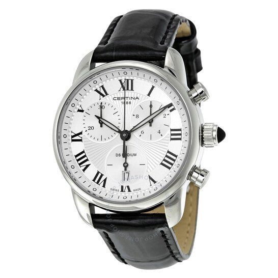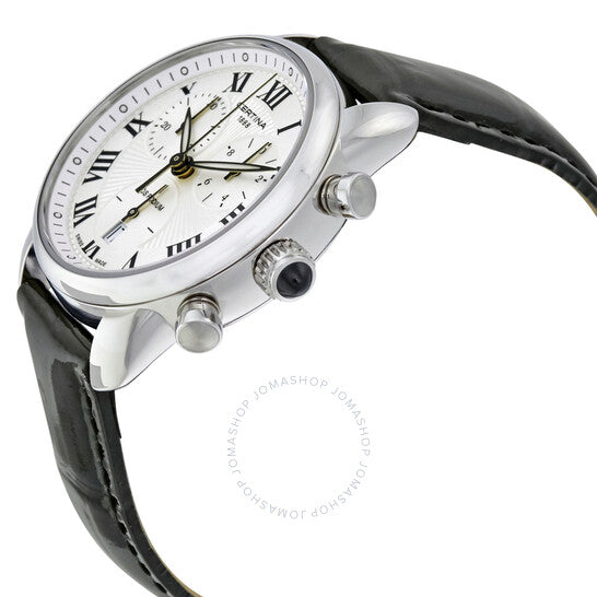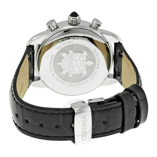 علبة من الفولاذ المقاوم للصدأ مع سوار أسود من جلد العجل. إطار ثابت من الفولاذ المقاوم للصدأ. ميناء فضي اللون بعقارب سوداء مضيئة وعلامات ساعات رومانية. علامات دقائق حول الحافة الخارجية. نوع الميناء: تناظري. عقارب وعلامات مضيئة. عرض التاريخ عند موضع الساعة السادسة. كرونوغراف - ثلاثة أقراص فرعية تعرض: ٦٠ ثانية، ٣٠ دقيقة، وعُشر الثانية. حركة كوارتز عيار ETA G15.211. كريستال ياقوت مقاوم للخدش. تاج قابل للسحب/الدفع. غطاء خلفي صلب. شكل دائري. حجم العلبة: ٣٤.٥٠ مم. سمكها: ١٠.٥ مم. عرض السوار: ١٧ مم. مشبك قابل للطي. مقاومة للماء حتى عمق ١٠٠ متر / ٣٣٠ قدمًا. الوظائف: كرونوغراف، تاريخ، ساعة، دقيقة، ثانية. طراز ساعة رياضية. علامة الساعة: صناعة سويسرية. ساعة سيرتينا دي إس بوديوم كرونوغراف للسيدات C025.217.16.018.00.