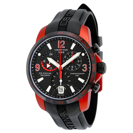 علبة ألمنيوم حمراء مطلية بتقنية PVD مع سوار مطاطي أسود. إطار أسود ثابت مطلي بتقنية PVD يعرض علامات التاكيميتر. ميناء أسود بعقارب مضيئة ومؤشرات ساعات. أرقام عربية تُشير إلى مواقع الساعات 3 و9 و12. علامات دقائق حول الحافة الخارجية. نوع الميناء: تناظري. عقارب ومؤشرات مضيئة. عرض التاريخ عند موضع الساعة 6. كرونوغراف - ثلاثة موانئ فرعية تعرض: 60 ثانية، 60 دقيقة / 12 ساعة، و24 ساعة. حركة كوارتز. كريستال ياقوت مقاوم للخدش. غطاء خلفي صلب. قطر العلبة: 42 مم. سُمكها: 13 مم. شكلها دائري. عرض السوار: 22 مم. مشبك تانغ. مقاومة للماء حتى عمق 100 متر / 330 قدمًا. الوظائف: كرونوغراف، تاكيميتر، تاريخ، ساعة، دقيقة، ثانية. طراز ساعة رياضية. ملصق الساعة: صناعة سويسرية. ساعة سيرتينا دي إس بوديوم كرونوغراف بمينا سوداء وألومنيوم ومطاط أسود للرجال C0016399705701.
