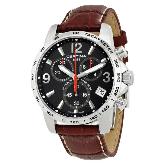 علبة من الفولاذ المقاوم للصدأ مع سوار جلدي بني. إطار ثابت من الفولاذ المقاوم للصدأ يعرض علامات التاكيميتر. ميناء أسود بعقارب فضية مضيئة ومؤشرات ساعات. أرقام عربية تشير إلى مواقع الساعات 3 و9 و12. علامات دقائق حول الحافة الخارجية. نوع الميناء: تناظري. عقارب ومؤشرات مضيئة. عرض التاريخ بين موقعي الساعة 4 و5. كرونوغراف - ثلاثة أقراص فرعية تعرض: 60 ثانية، 30 دقيقة، و1/10 من الثانية. حركة كوارتز ETA G10.212 PreciDrive. كريستال ياقوت مقاوم للخدش. غطاء خلفي صلب. حجم العلبة: 41 مم. سمكها: 11.7 مم. شكلها دائري. عرض السوار: 20 مم. مشبك قابل للطي. مقاومة للماء حتى عمق 100 متر / 330 قدمًا. الوظائف: كرونوغراف، تاكيميتر، تاريخ، ساعة، دقيقة، ثانية. تصميم كاجوال. ساعة سيرتينا دي إس بوديوم كرونوغراف للرجال C034.417.16.057.00.