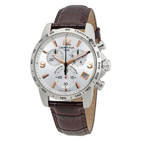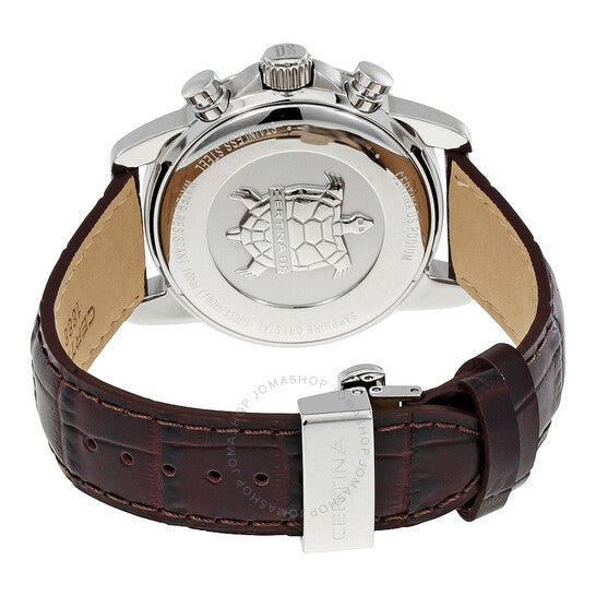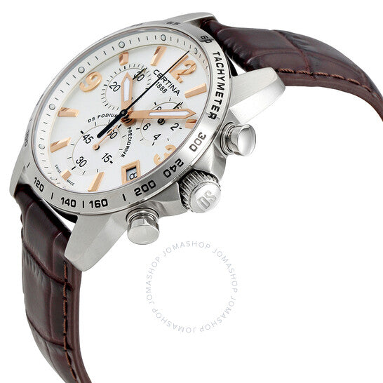 علبة من الفولاذ المقاوم للصدأ مع سوار بني من جلد التمساح. إطار ثابت من الفولاذ المقاوم للصدأ يعرض علامات مقياس سرعة الدوران. ميناء فضي مع عقارب مضيئة بلون الذهب الوردي وعلامات مؤشر للساعات. أرقام عربية تشير إلى الساعات 3 و9 و12. علامات دقائق حول الحافة الخارجية. نوع الميناء: تناظري. عقارب مضيئة. عرض التاريخ عند الساعة 4. كرونوغراف - ثلاثة أقراص فرعية تعرض: 60 ثانية، 30 دقيقة، و1/10 من الثانية. حركة كوارتز. كريستال ياقوت مقاوم للخدش. غطاء خلفي صلب. حجم العلبة: 41 مم. سمكها: 12 مم. شكلها دائري. عرض السوار: 22 مم. مشبك قابل للطي بزر ضغط. مقاومة للماء حتى عمق 100 متر / 330 قدمًا. الوظائف: كرونوغراف، مقياس سرعة الدوران، التاريخ، الساعة، الدقيقة، الثانية. طراز ساعة رسمية. ملصق الساعة: صناعة سويسرية. ساعة سيرتينا دي إس بوديوم بريسيدرايف كرونوغراف للرجال C034.417.16.037.01.