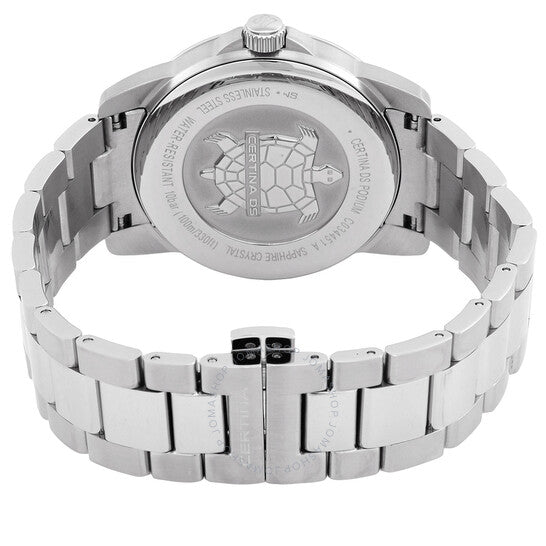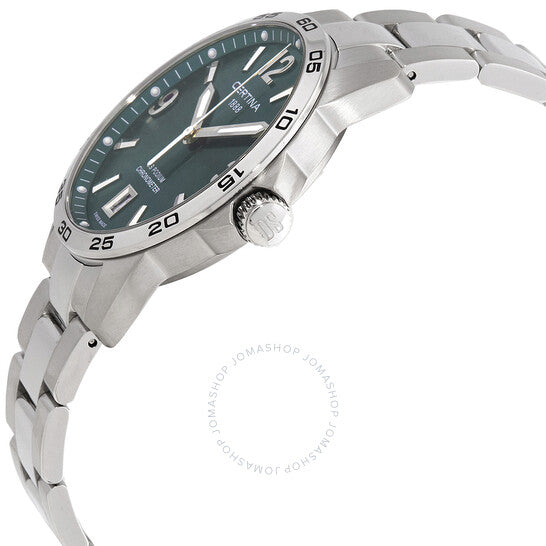 علبة وسوار من الفولاذ المقاوم للصدأ فضي اللون. إطار ثابت من الفولاذ المقاوم للصدأ فضي اللون. ميناء أخضر بعقارب فضية اللون وعلامات ساعات بأرقام عربية. يظهر مؤشر الأرقام العربية عند الساعة 3 و9 و12. علامات الدقائق حول الحافة الخارجية. نوع الميناء: تناظري. عقارب مضيئة. عرض التاريخ عند الساعة 6. حركة كوارتز F07.412. زجاج ياقوتي مقاوم للخدش. غطاء خلفي صلب. شكل العلبة دائري، مقاسها: 40 مم، سمكها: 9.42 مم. عرض السوار: 20 مم. مشبك قابل للطي مع مفتاح أمان. مقاومة للماء حتى عمق 100 متر / 330 قدمًا. الوظائف: التاريخ، الساعة، الدقائق، الثانية. سلسلة Ds Podium. طراز ساعة رسمية. علامة الساعة: صناعة سويسرية. ساعة Certina DS Podium كوارتز للرجال بمينا أخضر، C0344511109700.