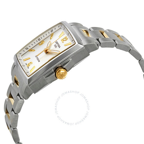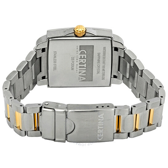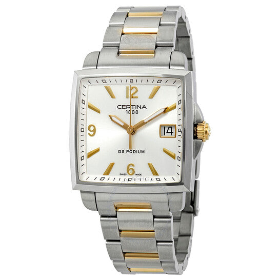 علبة من الفولاذ المقاوم للصدأ مع سوار من الفولاذ المقاوم للصدأ بلمسات من الذهب الأصفر. إطار ثابت من الفولاذ المقاوم للصدأ. ميناء فضي مع عقارب مضيئة من الذهب الأصفر ومؤشرات ساعات. أرقام عربية تُشير إلى الساعات 6 و9 و12. مؤشرات دقائق حول الحافة الخارجية. نوع الميناء: تناظري. عقارب ومؤشرات مضيئة. عرض التاريخ عند الساعة 3. حركة كوارتز ETA عيار F06.161. زجاج من الياقوت المقاوم للخدش. غطاء خلفي صلب. شكل العلبة مربع. حجم العلبة: 32 مم. سمكها: 11.7 مم. عرض السوار: 16 مم. مشبك قابل للطي. مقاومة للماء حتى عمق 100 متر / 330 قدمًا. الوظائف: التاريخ، الساعة، الدقائق، الثواني، مؤشر عمر البطارية. معلومات إضافية: مناسبة للغطس والسباحة، ولكنها غير مناسبة للغوص. تصميم كاجوال. علامة الساعة: صناعة سويسرية. ساعة سيرتينا دي إس بوديوم للسيدات بمينا فضي C001.310.22.037.00.