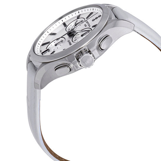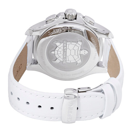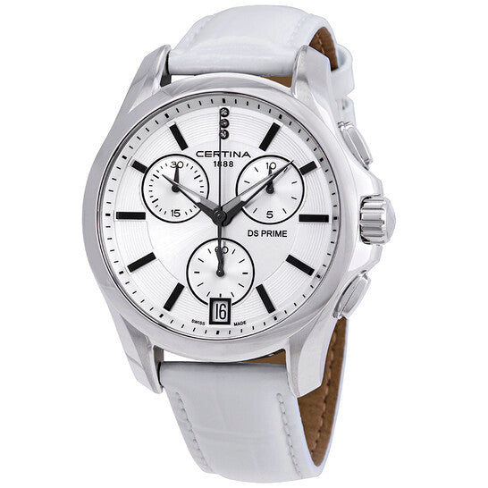 علبة من الفولاذ المقاوم للصدأ مع سوار جلدي أبيض. إطار ثابت من الفولاذ المقاوم للصدأ. ميناء فضي بعقارب سوداء مضيئة وعلامات ساعات. يظهر مؤشر مرصع بالألماس عند موضع الساعة ١٢. نوع الميناء: تناظري. عقارب مضيئة. عرض التاريخ عند موضع الساعة ٦. كرونوغراف - ثلاثة أقراص فرعية تعرض: ٦٠ ثانية، ٣٠ دقيقة، وعُشر الثانية. حركة كوارتز عيار ETA G10.211. كريستال ياقوت مقاوم للخدش. تاج قابل للسحب/الدفع. غطاء خلفي صلب. شكل دائري. حجم العلبة: ٣٩ مم. سمكها: ١١.٠٥ مم. عرض السوار: ١٨ مم. مشبك تانغ. مقاومة للماء حتى عمق ١٠٠ متر / ٣٣٠ قدمًا. الوظائف: كرونوغراف، تاريخ، ساعة، دقيقة، ثانية. تصميم كاجوال. علامة الساعة: صناعة سويسرية. ساعة سيرتينا دي إس برايم كرونوغراف بمينا فضي للسيدات C004.217.16.036.00.