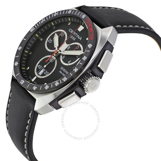 علبة من الفولاذ المقاوم للصدأ مع سوار جلدي أسود. إطار ثابت أسود مطلي بتقنية PVD يعرض علامات التاكيميتر. ميناء أسود بعقارب مضيئة وعلامات ساعات. علامات دقائق حول الحافة الخارجية. نوع الميناء: تناظري. عقارب وعلامات مضيئة. عرض التاريخ فوق موضع الساعة السادسة. كرونوغراف - ثلاثة أقراص فرعية تعرض: 60 ثانية، 30 دقيقة، و1/10 من الثانية. حركة كوارتز. كريستال ياقوتي مقاوم للخدش. غطاء خلفي صلب. حجم العلبة: 41 مم. سمكها: 13 مم. شكلها دائري. مشبك تانغ. مقاومة للماء حتى عمق 100 متر / 330 قدم. الوظائف: كرونوغراف، تاكيميتر، تاريخ، ساعة، دقيقة، ثانية. تصميم كاجوال. علامة الساعة: صناعة سويسرية. ساعة سيرتينا دي إس رويال كرونوغراف للرجال بمينا سوداء، رقم الموديل C010.417.16.051.01.