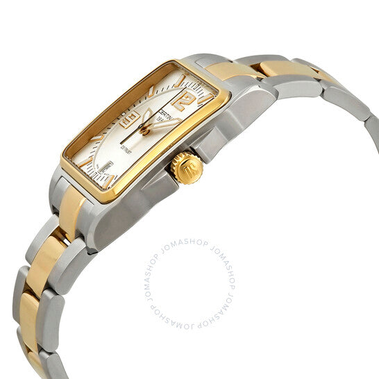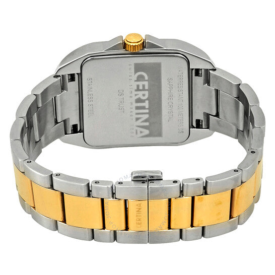 علبة من الفولاذ المقاوم للصدأ بسوار من الفولاذ المقاوم للصدأ ثنائي اللون (ذهبي أصفر وفضي). إطار ثابت من الذهب الأصفر. ميناء فضي مع عقارب مضيئة ومؤشرات ساعات ذهبية صفراء. أرقام عربية تُشير إلى الساعات 3 و9 و12. مؤشرات دقائق حول الحافة الخارجية. نوع الميناء: تناظري. عقارب ومؤشرات مضيئة. عرض التاريخ عند الساعة 6. حركة كوارتز عيار ETA 955.112. زجاج ياقوت مقاوم للخدش. تاج قابل للسحب/الدفع. غطاء خلفي صلب. شكل مستطيل. حجم العلبة: 34 مم. سمكها: 8.6 مم. عرض السوار: 20 مم. مشبك قابل للطي. مقاومة للماء حتى عمق 100 متر / 330 قدمًا. الوظائف: التاريخ، الساعة، الدقائق، الثواني، مؤشر عمر البطارية. تصميم ساعة كاجوال. علامة الساعة: سويسرية الصنع. ساعة سيرتينا دي إس تراست للسيدات بمينا فضي C019.510.22.037.00.