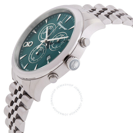 علبة وسوار من الفولاذ المقاوم للصدأ فضي اللون. إطار ثابت من الفولاذ المقاوم للصدأ فضي اللون. ميناء أخضر مع عقارب ومؤشرات ساعات فضية اللون. رمز غانسيو مزدوج عند موضع الساعة 8. مؤشرات دقائق حول الحافة الخارجية. نوع الميناء: تناظري. عقارب ومؤشرات مضيئة. عرض التاريخ عند موضع الساعة 4. كرونوغراف - ثلاثة موانئ فرعية تعرض: 60 ثانية، 30 دقيقة، و1/10 من الثانية. آلية حركة كوارتز. زجاج ياقوت مقاوم للخدش. تاج قابل للسحب/الدفع. غطاء خلفي صلب. شكل دائري، حجم العلبة: 43 مم. مشبك فراشة. مقاومة للماء حتى عمق 50 مترًا / 165 قدمًا. الوظائف: كرونوغراف، تاريخ، ساعة، دقيقة، ثانية. سلسلة ديو. طراز ساعة رياضية. علامة الساعة: صناعة سويسرية. ساعة فيراغامو ديو كرونوغراف كوارتز للرجال بمينا خضراء SFEZ01124.