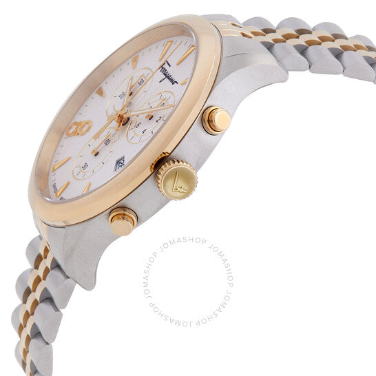 علبة فضية اللون من الفولاذ المقاوم للصدأ مع سوار ثنائي اللون (فضي وذهبي). إطار ثابت من الفولاذ المقاوم للصدأ ذهبي اللون. ميناء أبيض بعقارب ومؤشرات ساعات ذهبية اللون. رمز غانسيو مزدوج عند موضع الساعة 8. مؤشرات دقائق حول الحافة الخارجية. نوع الميناء: تناظري. عقارب ومؤشرات مضيئة. عرض التاريخ عند موضع الساعة 4. كرونوغراف - ثلاثة موانئ فرعية تعرض: 60 ثانية، 30 دقيقة، و1/10 من الثانية. حركة كوارتز. كريستال ياقوت مقاوم للخدش. تاج قابل للسحب/الدفع. غطاء خلفي صلب. شكل دائري، حجم العلبة: 43 مم. مشبك فراشة. مقاومة للماء حتى عمق 50 مترًا / 165 قدمًا. الوظائف: كرونوغراف، تاريخ، ساعة، دقيقة، ثانية. سلسلة ديو. طراز ساعة رياضية. علامة الساعة: صناعة سويسرية. ساعة فيراغامو ديو كرونوغراف كوارتز بيضاء للرجال SFEZ01424.