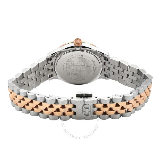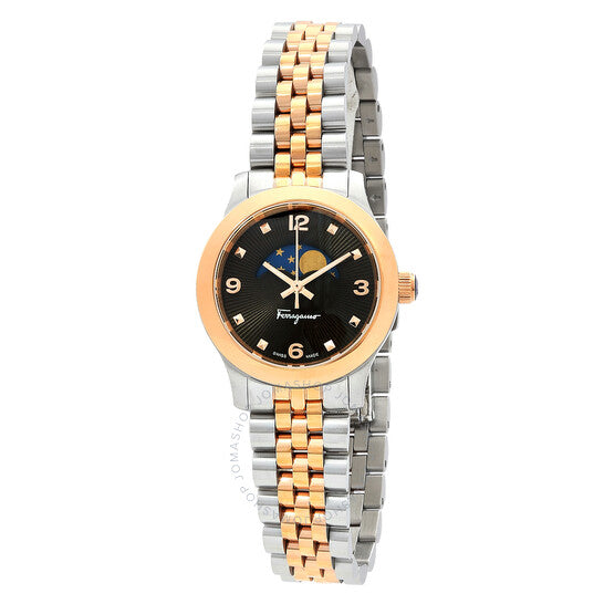 علبة فضية اللون من الفولاذ المقاوم للصدأ مع سوار من الفولاذ المقاوم للصدأ ثنائي اللون (فضي وذهبي وردي). إطار ثابت من الفولاذ المقاوم للصدأ بلون ذهبي وردي. ميناء بني مع عقارب بلون ذهبي وردي وعلامات ساعات بأرقام عربية. يظهر مؤشر الأرقام العربية عند مواضع الساعة 3 و6 و9 و12. علامات دقائق حول الحافة الخارجية. نوع الميناء: تناظري. عقارب مضيئة. حركة كوارتز. زجاج ياقوت مقاوم للخدش. تاج قابل للسحب/الدفع. غطاء خلفي صلب. شكل دائري، حجم العلبة: 28 مم. مشبك قابل للطي بزر ضغط. مقاومة للماء حتى عمق 30 مترًا / 100 قدم. الوظائف: التاريخ، الساعة، الدقيقة، الثانية، طور القمر. سلسلة Duo Moonphase. طراز ساعة رياضية. علامة الساعة: صناعة سويسرية. ساعة سلفاتوري فيراغامو Duo Moonphase كوارتز نسائية بمينا بني SFMN00622.
