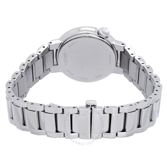 علبة وسوار من الفولاذ المقاوم للصدأ فضي اللون. إطار ثابت من الفولاذ المقاوم للصدأ فضي اللون. ميناء أزرق من عرق اللؤلؤ مع عقارب فضية اللون وعلامات ساعات منقطة. علامة ألماس عند موضع الساعة 8. نوع الميناء: تناظري. حركة سيتيزن كاليبر إيكو-درايف E031 إيكو-درايف. زجاج ياقوت مقاوم للخدش. تاج قابل للسحب/الدفع. غطاء خلفي صلب. شكل العلبة دائري، مقاسها: 30 مم. مشبك قابل للطي. مقاومة للماء حتى عمق 50 مترًا / 165 قدمًا. الوظائف: الساعات، الدقائق، الثواني، تعمل بالطاقة الشمسية. تصميم كاجوال. علامة الساعة: Japan Movt. ساعة سيتيزن إيكو-درايف نسائية زرقاء من عرق اللؤلؤ EM0910-80N.