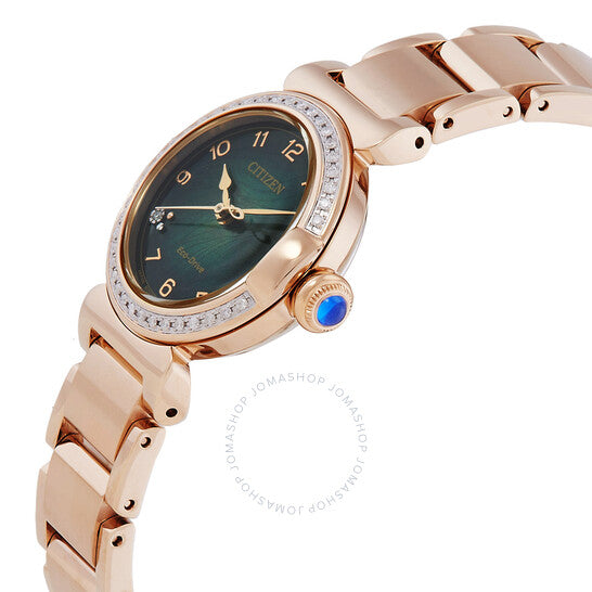 علبة وسوار من الفولاذ المقاوم للصدأ بلون الذهب الوردي. إطار ثابت بلون الذهب الوردي مرصع بالألماس. ميناء أخضر بنفث الحبر مع عقارب بلون الذهب الوردي وعلامات ساعات بأرقام عربية. نوع الميناء: تناظري. حركة سيتيزن كاليبر إيكو-درايف E031 إيكو-درايف. زجاج من الياقوت المقاوم للخدش. تاج قابل للسحب/الدفع. غطاء خلفي صلب. شكل العلبة دائري، مقاسها 26 مم. إبزيم قابل للطي بزر ضغط. مقاومة للماء حتى عمق 50 مترًا / 165 قدمًا. الوظائف: الساعات، الدقائق، الثواني، تعمل بالطاقة الشمسية. سلسلة L Mae. طراز ساعة رسمية. علامة الساعة: Japan Movt. ساعة سيتيزن L Mae الماسية للسيدات EM1123-62X.