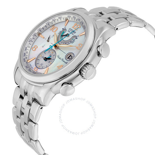 علبة من الفولاذ المقاوم للصدأ مع سوار فضي من الفولاذ المقاوم للصدأ. إطار ثابت من الفولاذ المقاوم للصدأ. ميناء من عرق اللؤلؤ مع عقارب بلون الذهب الوردي وأرقام عربية متناوبة وعلامات ساعات. علامات دقائق. مدن التوقيت العالمي حول الحافة الخارجية. نوع الميناء: تناظري. عرض التاريخ عند موضع الساعة 3. عرض أيام الأسبوع أسفل موضع الساعة 12. ميناءان فرعيان يعرضان: 24 ساعة. مؤشر احتياطي الطاقة. حركة كوارتز إيكو درايف. كريستال ياقوتي مقاوم للخدش. غطاء خلفي صلب. قطر العلبة: 39 مم. سمكها: 10 مم. شكل العلبة دائري. عرض السوار: 20 مم. مشبك قابل للطي بزر ضغط. مقاومة للماء حتى عمق 100 متر / 330 قدمًا. الوظائف: التاريخ، اليوم، الساعة، الدقيقة، الثانية. تصميم ساعة كاجوال. ملصق الساعة: Japan Movt. إصدارات المنتج: FC0000 59D، FC0000.59D، FC000059D. ساعة سيتيزن إيكو درايف للسيدات بمينا من عرق اللؤلؤ وسوار من الفولاذ المقاوم للصدأ، FC0000-59D.