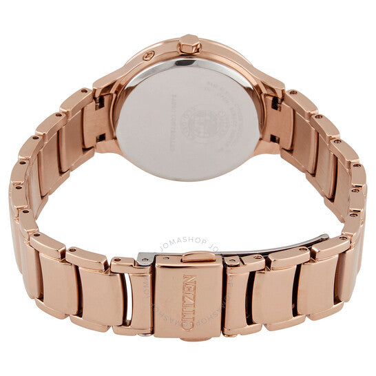 علبة وسوار من الفولاذ المقاوم للصدأ بلون الذهب الوردي. إطار ثابت بلون الذهب الوردي. ميناء من عرق اللؤلؤ مع عقارب مضيئة بلون الذهب الوردي وعلامات ساعات. يظهر الرقم الروماني عند موضع الساعة ١٢. علامات الدقائق. مدن التوقيت العالمي حول الحافة الخارجية. نوع الميناء: تناظري. عقارب مضيئة. عرض التاريخ عند موضع الساعة ٣. حركة سيتيزن عيار H246 إيكو-درايف. كريستال ياقوتي مقاوم للخدش. غطاء خلفي صلب. شكل دائري. حجم العلبة: ٣٠ مم. سُمكها: ٨.٥ مم. مشبك قابل للطي مع مفتاح أمان. مقاومة للماء حتى عمق ٥٠ مترًا / ١٦٥ قدمًا. الوظائف: إيكو-درايف، تقويم دائم، تحكم لاسلكي، توقيت عالمي، تاريخ، ساعة، دقيقة، ثانية. طراز ساعة رسمية. ملصق الساعة: Japan Movt. ساعة سيتيزن إيكو-درايف بيربتشوال وورلد تايم نسائية EC1173-87D.