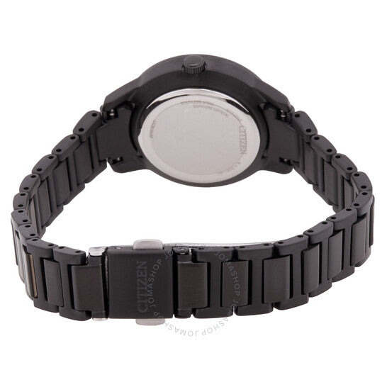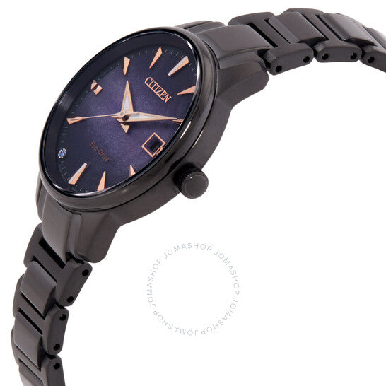 علبة وسوار من الفولاذ المقاوم للصدأ IP أسود. إطار ثابت من الفولاذ المقاوم للصدأ IP أسود. ميناء بنفسجي مع عقارب وعلامات ساعات ذهبية وردية. علامة ماسية عند موضع الساعة 7. علامات دقائق حول الحافة الخارجية. نوع الميناء: تناظري. عقارب مضيئة. نافذة عرض التاريخ عند موضع الساعة 3. آلية حركة سيتيزن كاليبر إيكو-درايف E011 إيكو-درايف. زجاج ياقوت مقاوم للخدش. تاج قابل للسحب/الدفع. غطاء خلفي صلب. شكل دائري، مقاس العلبة: 29.2 مم، سمكها: 8.9 مم. مشبك قابل للطي بزر ضغط. مقاومة للماء حتى عمق 50 مترًا / 165 قدمًا. الوظائف: التاريخ، الساعة، الدقائق، الثواني، تعمل بالطاقة الشمسية. سلسلة إيكو-درايف. تصميم كاجوال. اسم الساعة: Japan Movt. ساعة سيتيزن إيكو-درايف نسائية بمينا بنفسجي EW2595-81X.