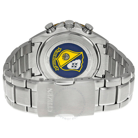 علبة من الفولاذ المقاوم للصدأ مع سوار من الفولاذ المقاوم للصدأ. إطار أزرق ثابت مطلي بالأيونات. ميناء أزرق بعقارب مضيئة وعلامات ساعات. علامات دقائق. مدن التوقيت العالمي. علامات حاسبة للملاحة حول الحافة الخارجية. نوع الميناء: تناظري. عقارب وعلامات مضيئة. عرض التاريخ عند موضع الساعة 3. ثلاثة أقراص فرعية تعرض: 60 ثانية، 24 ساعة، و1/100 ثانية/يوم من أيام الأسبوع. ساعة إيكو درايف H800 أتوميك تايم كيبينج، حركة إيكو درايف تعمل بالتحكم اللاسلكي. زجاج ياقوت مقاوم للخدش. تاج قابل للسحب/الدفع. غطاء خلفي صلب. شكل دائري. حجم الهيكل: 43 مم. سمك الهيكل: 12 مم. عرض السوار: 22 مم. طول السوار: 8.5 بوصة. مشبك قابل للطي بزر ضغط مزدوج. مقاومة للماء حتى عمق 200 متر / 660 قدمًا. الوظائف: كرونوغراف، تاريخ، ساعة، دقيقة، ثانية، تقويم دائم، توقيت عالمي. سلسلة بلو أنجلز. طراز ساعة رياضية. علامة الساعة: Japan Movt. إصدارات الساعة: AT8020 54L، AT8020.54L، AT802054L. ساعة سيتيزن إيكو درايف بلو أنجلز كرونوغراف للرجال AT8020-54L.
