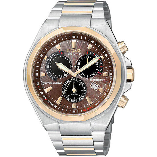 علبة وسوار من الفولاذ المقاوم للصدأ مصقولان بلونين. ميناء بني مزخرف. مشبك قابل للطي بزر ضغط. إطار ثابت. زجاج معدني. آلية حركة كوارتز. قطر العلبة 46 مم، سمكها 11 مم. مقاومة للماء حتى عمق 100 متر. تقويم تاريخي عند موانئ فرعية بدقتي 4 ساعات وساعة واحدة و1/20 ثانية. وضع التوقيت المزدوج وساعة منبه. عقرب ومؤشر ساعات مضيءان بلون ذهبي وردي مصقول. ساعة سيتيزن إيكو درايف للرجال BL5416-52X.