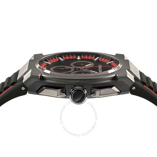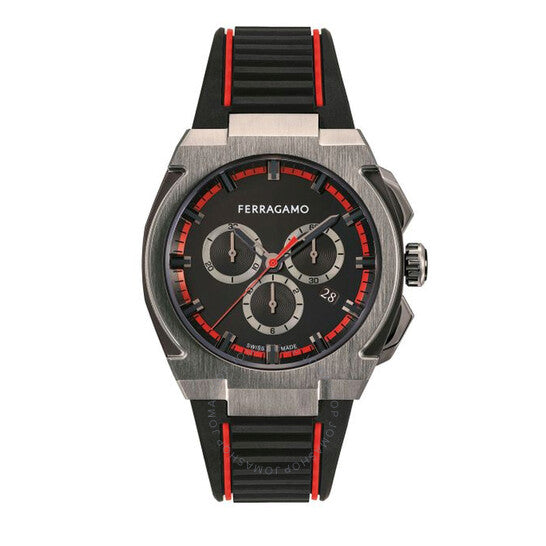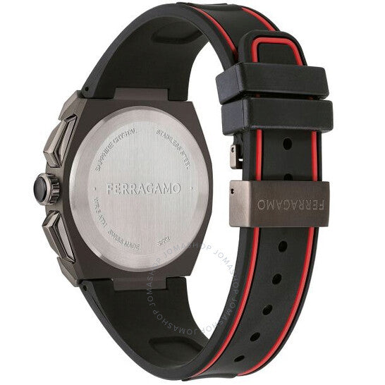 علبة من الفولاذ المقاوم للصدأ مطلية بالأيونات بلون البندقية، مع حزام أسود من البولي يوريثان المعاد تدويره. إطار ثابت من الفولاذ المقاوم للصدأ بلون البندقية. ميناء أسود بعقارب وعلامات ساعات سوداء. علامات دقائق حول الحافة الخارجية. نوع الميناء: تناظري. عرض التاريخ عند موضع الساعة الرابعة. كرونوغراف - ثلاثة أقراص فرعية تعرض: ٦٠ ثانية، ٣٠ دقيقة، وعُشر الثانية. آلية حركة كوارتز. زجاج ياقوت مقاوم للخدش. تاج لولبي. غطاء خلفي صلب. شكل دائري، مقاس العلبة: ٤٣ مم. مشبك بإبزيم. مقاومة للماء حتى عمق ٥٠ مترًا / ١٦٥ قدمًا. الوظائف: كرونوغراف، تاريخ، ساعة، دقيقة، ثانية. سلسلة إيدج. ساعة كاجوال أنيقة. ساعة فيراغامو إيدج كرونوغراف كوارتز للرجال بمينا سوداء، SFK200323.